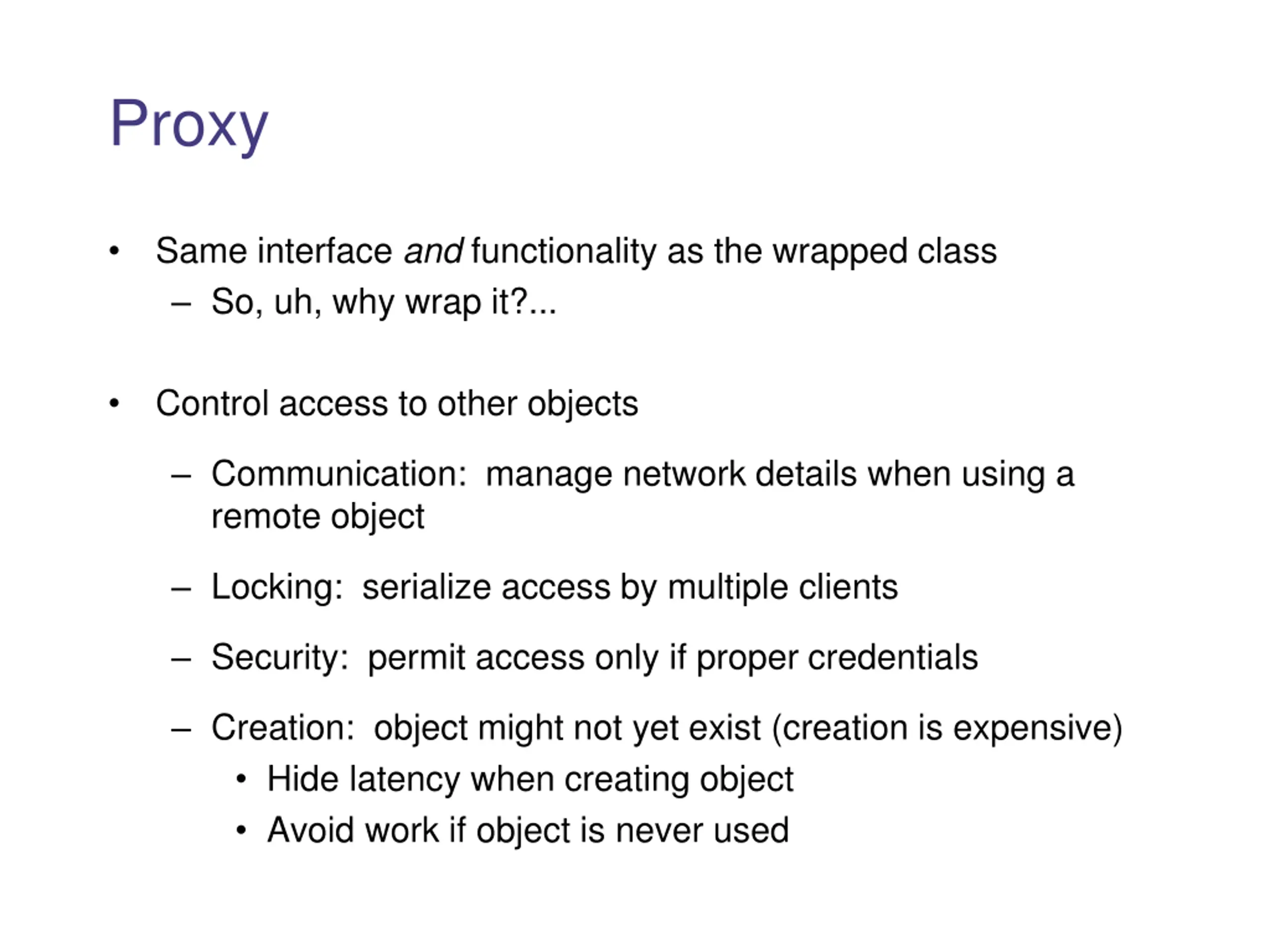 Proxy Same interface and functionality as the wrapped class So, uh, why wrap it?... Control access to other objects Communication: manage network details when using a remote object Locking: serialize access by multiple clients Security: permit access only if proper credentials Creation: object might not yet exist (creation is expensive) Hide latency when creating object Avoid work if object is never used