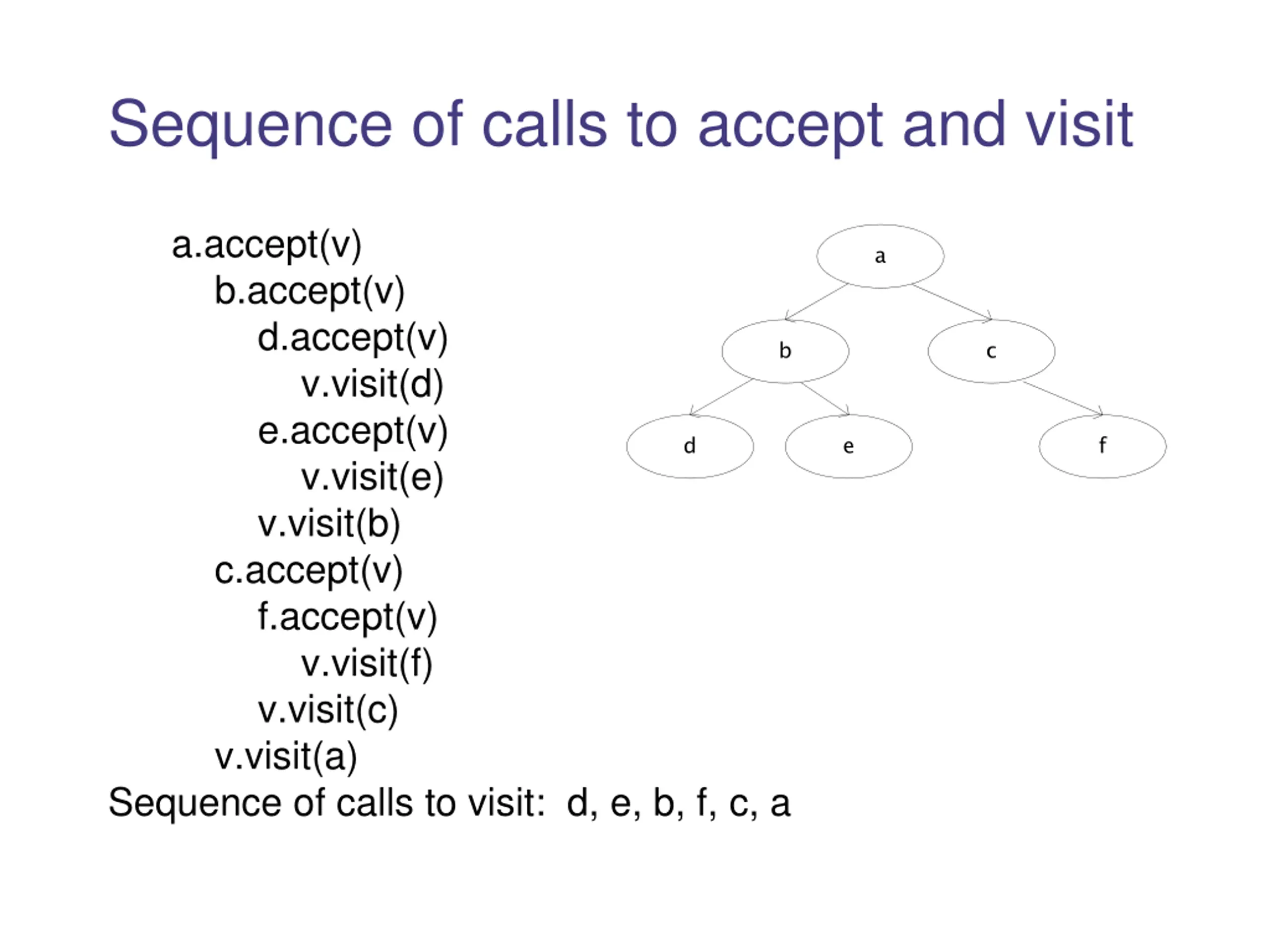 Sequence of calls to accept and visit a.accept(v) b.accept(v) d.accept(v) v.visit(d) e.accept(v) v.visit(e) v.visit(b) c.accept(v) f.accept(v) v.visit(f) v.visit(c) v.visit(a) Sequence of calls to visit: d, e, b, f, c, a a b c d e f