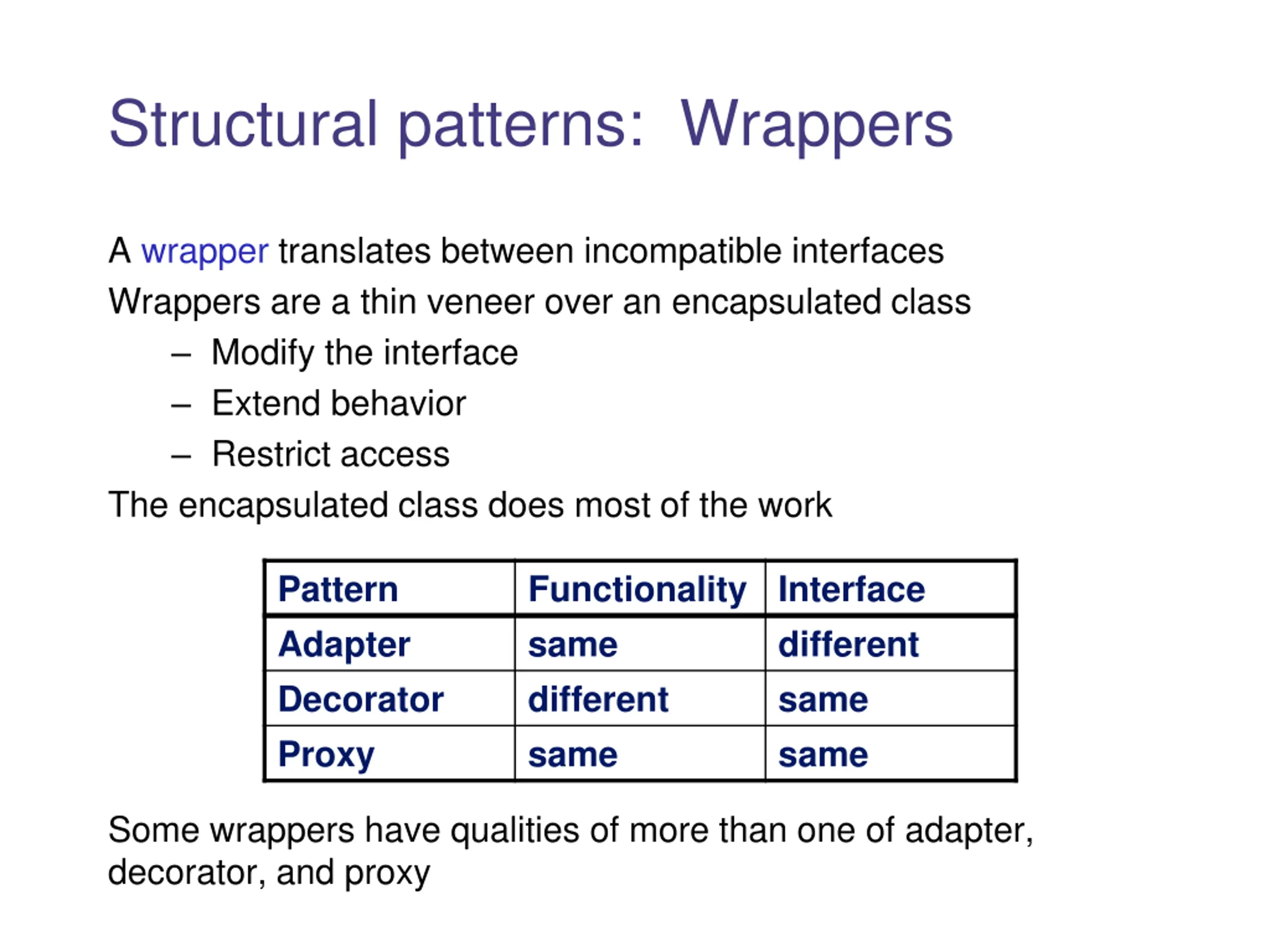 Structural patterns: Wrappers A wrapper translates between incompatible interfaces Wrappers are a thin veneer over an encapsulated class Modify the interface Extend behavior Restrict access The encapsulated class does most of the work Pattern Adapter Decorator Proxy Functionality Interface same different same different same same Some wrappers have qualities of more than one of adapter, decorator, and proxy