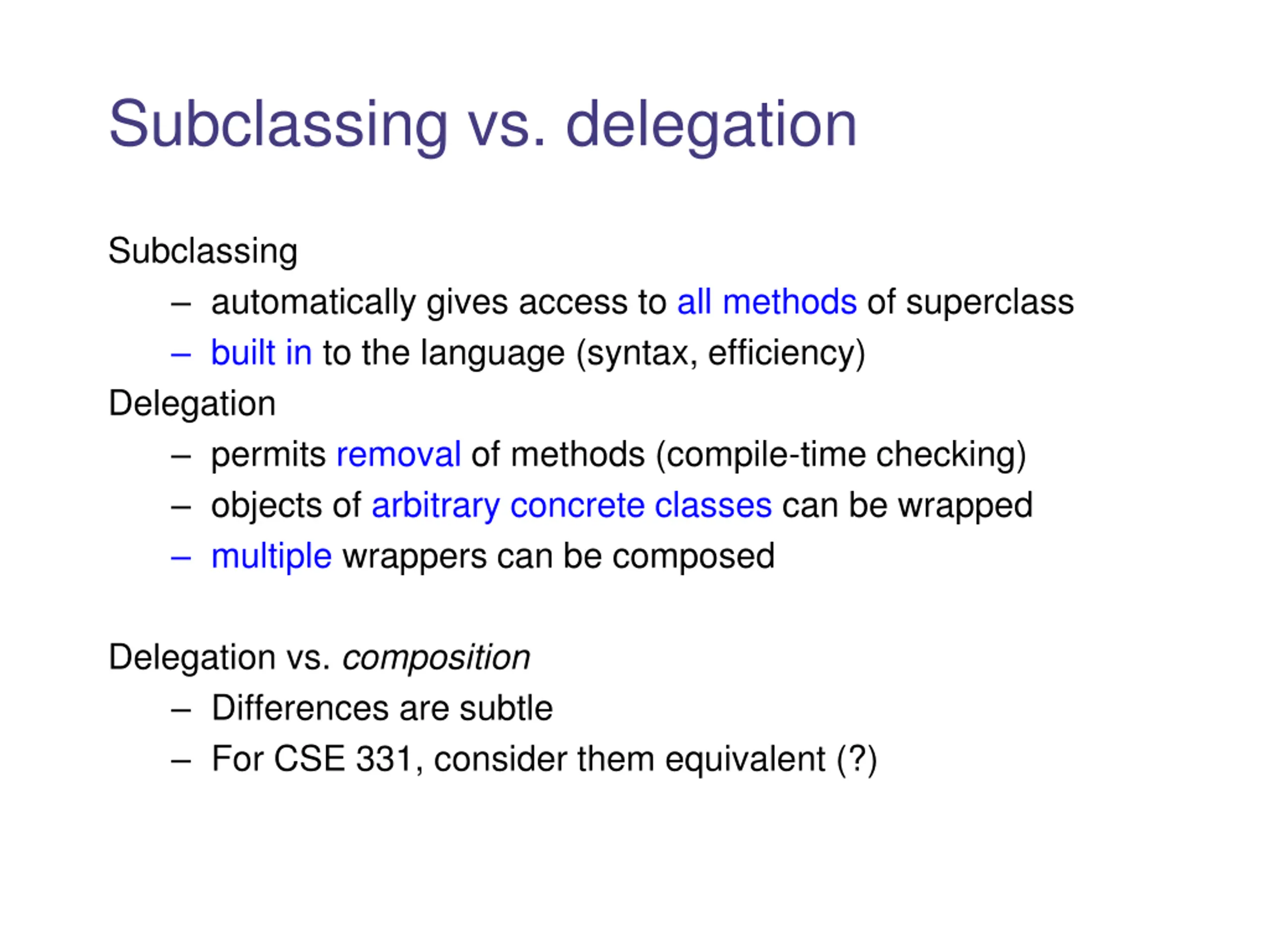 Subclassing vs. delegation Subclassing automatically gives access to all methods of superclass built in to the language (syntax, efficiency) Delegation permits removal of methods (compile-time checking) objects of arbitrary concrete classes can be wrapped multiple wrappers can be composed Delegation vs. composition Differences are subtle For CSE 331, consider them equivalent (?)