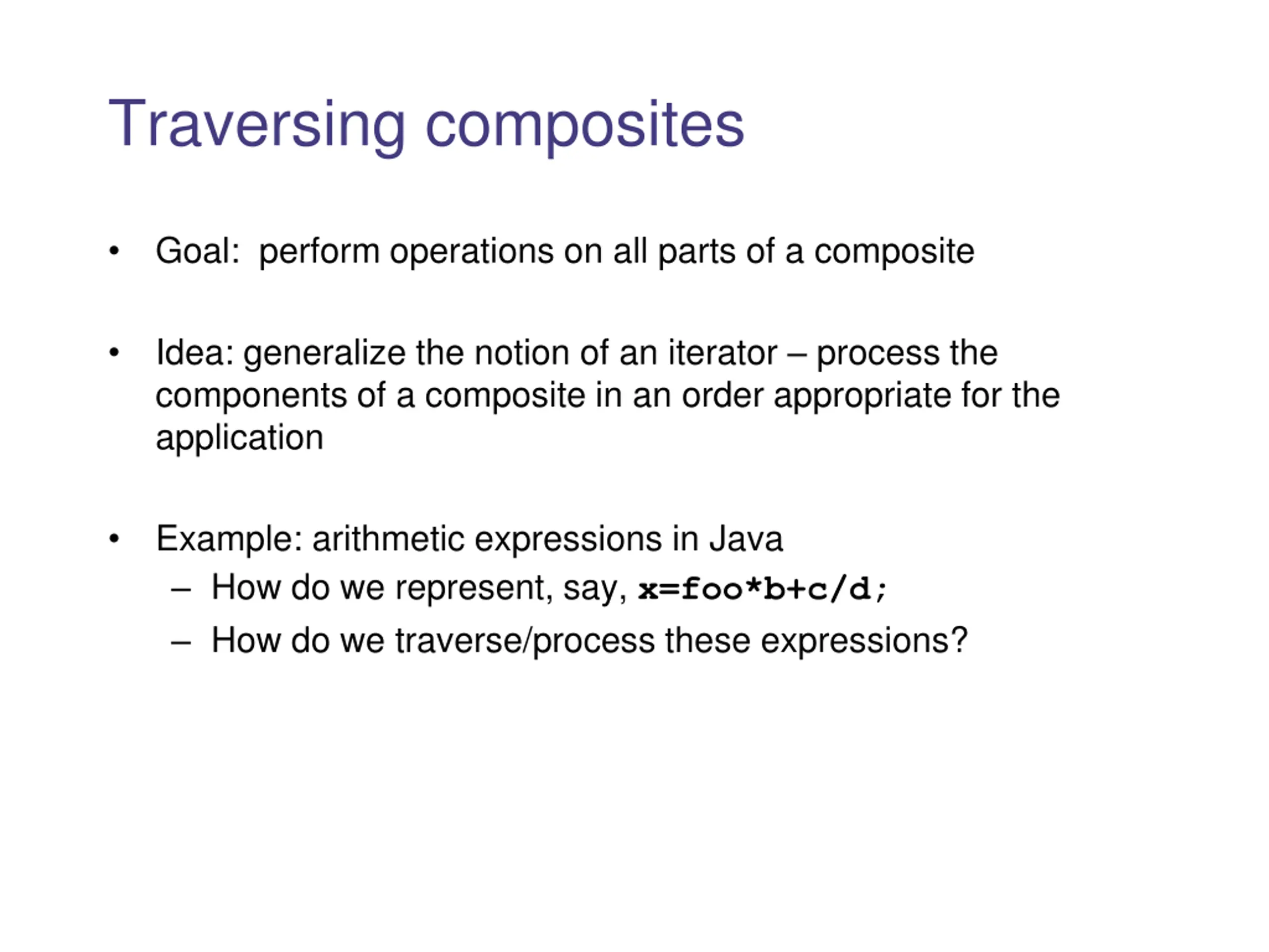 Traversing composites Goal: perform operations on all parts of a composite Idea: generalize the notion of an iterator process the components of a composite in an order appropriate for the application Example: arithmetic expressions in Java How do we represent, say, x=foo*b+c/d; How do we traverse/process these expressions?