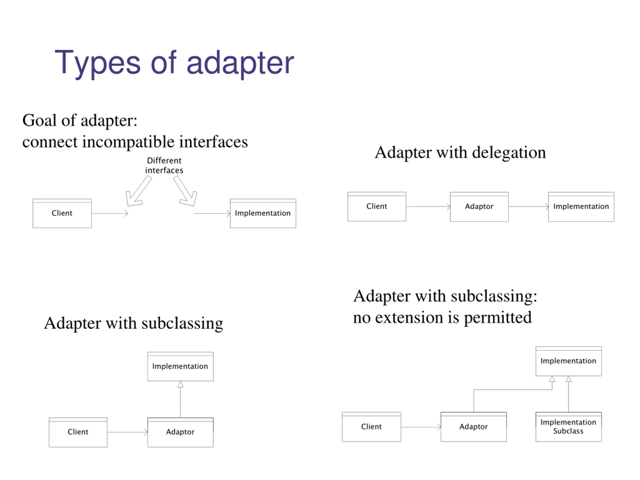 Types of adapter Goal of adapter: connect incompatible interfaces Adapter with delegation Different interfaces Client Adaptor Implementation Client Implementation Adapter with subclassing: no extension is permitted Adapter with subclassing Implementation Implementation Implementation Subclass Client Adaptor Client Adaptor