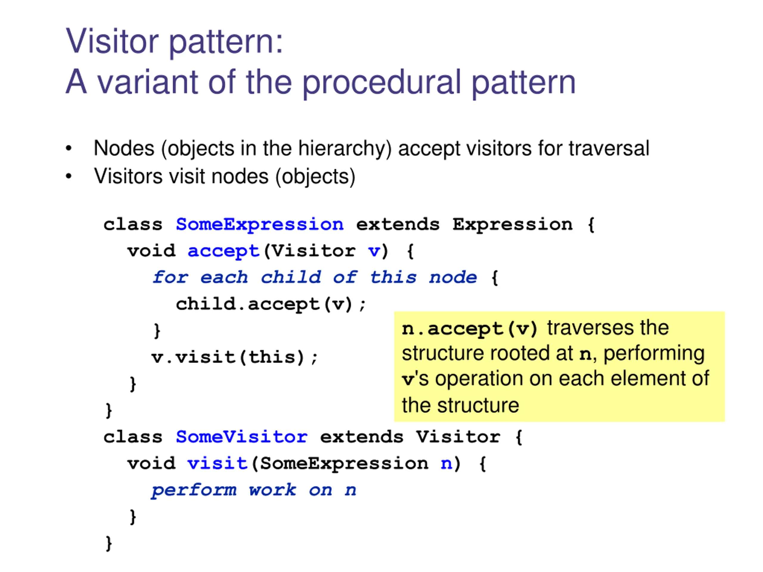 Visitor pattern: A variant of the procedural pattern Nodes (objects in the hierarchy) accept visitors for traversal Visitors visit nodes (objects) class SomeExpression extends Expression { void accept(Visitor v) { for each child of this node { child.accept(v); } v.visit(this); } } class SomeVisitor extends Visitor { void visit(SomeExpression n) { perform work on n } } n.accept(v)traverses the structure rooted at n, performing v's operation on each element of the structure