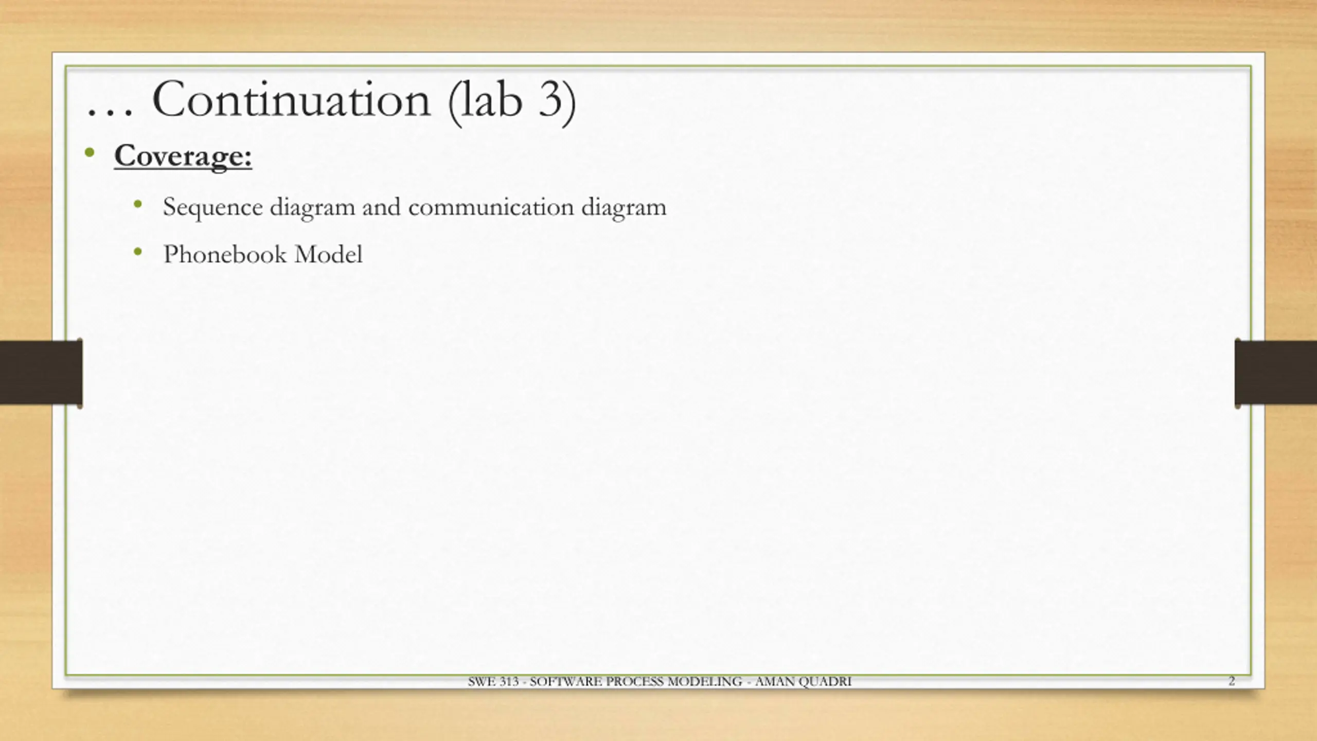 Continuation (lab 3) Coverage: Sequence diagram and communication diagram Phonebook Model 2 SWE 313 - SOFTWARE PROCESS MODELING - AMAN QUADRI