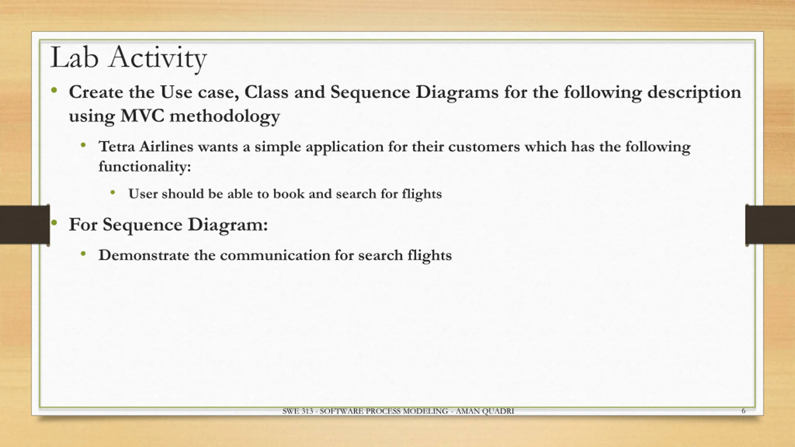 Lab Activity Create the Use case, Class and Sequence Diagrams for the following description using MVC methodology Tetra Airlines wants a simple application for their customers which has the following functionality: User should be able to book and search for flights For Sequence Diagram: Demonstrate the communication for search flights 6 SWE 313 - SOFTWARE PROCESS MODELING - AMAN QUADRI