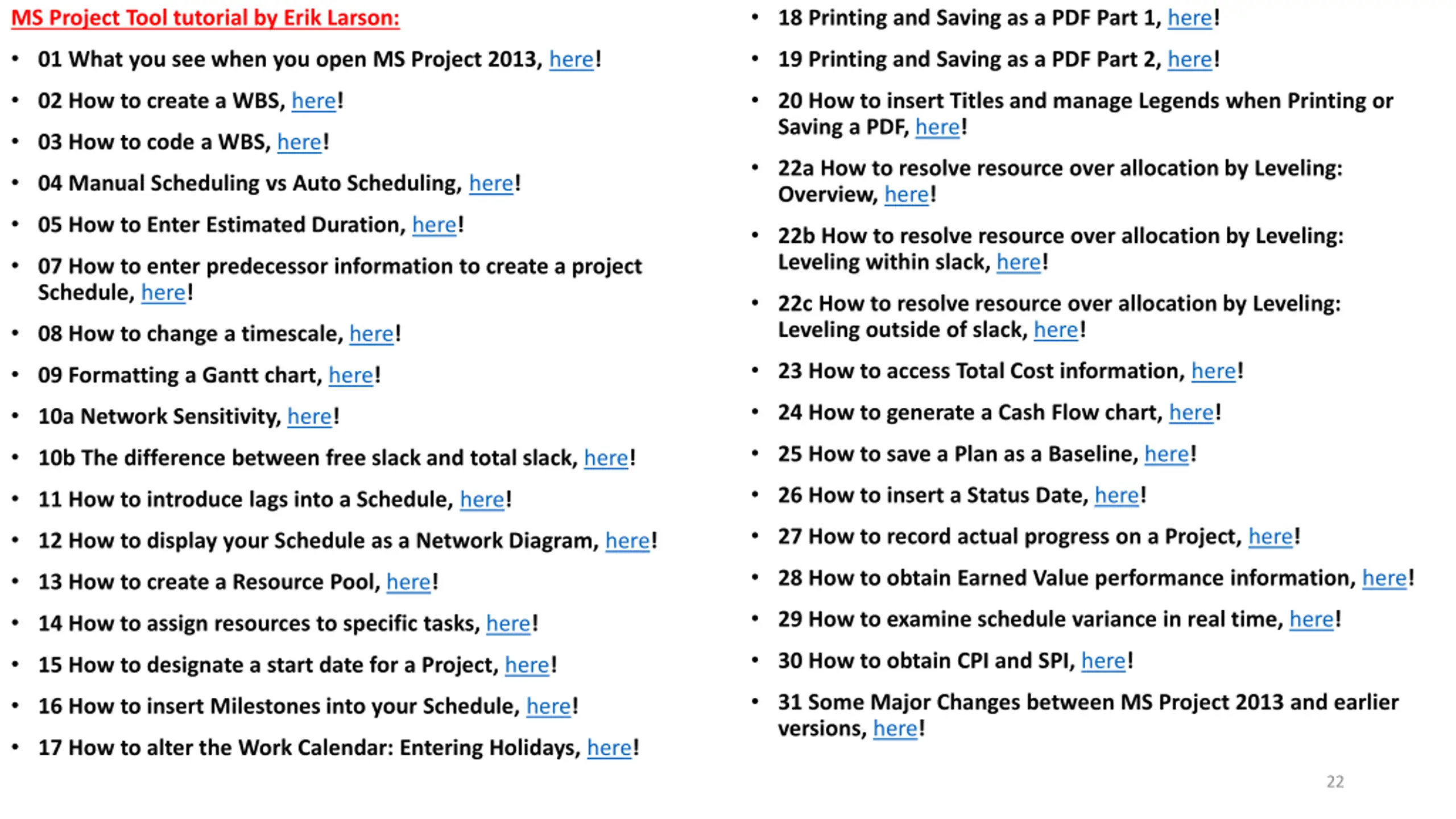 18 Printing and Saving as a PDF Part 1, here! MS Project Tool tutorial by Erik Larson: 01 What you see when you open MS Project 2013, here! 19 Printing and Saving as a PDF Part 2, here! 02 How to create a WBS, here! 20 How to insert Titles and manage Legends when Printing or Saving a PDF, here! 03 How to code a WBS, here! 22a How to resolve resource over allocation by Leveling: Overview, here! 04 Manual Scheduling vs Auto Scheduling, here! 05 How to Enter Estimated Duration, here! 22b How to resolve resource over allocation by Leveling: Leveling within slack, here! 07 How to enter predecessor information to create a project Schedule, here! 22c How to resolve resource over allocation by Leveling: Leveling outside of slack, here! 08 How to change a timescale, here! 23 How to access Total Cost information, here! 09 Formatting a Gantt chart, here! 24 How to generate a Cash Flow chart, here! 10a Network Sensitivity, here! 25 How to save a Plan as a Baseline, here! 10b The difference between free slack and total slack, here! 26 How to insert a Status Date, here! 11 How to introduce lags into a Schedule, here! 27 How to record actual progress on a Project, here! 12 How to display your Schedule as a Network Diagram, here! 28 How to obtain Earned Value performance information, here! 13 How to create a Resource Pool, here! 29 How to examine schedule variance in real time, here! 14 How to assign resources to specific tasks, here! 30 How to obtain CPI and SPI, here! 15 How to designate a start date for a Project, here! 31 Some Major Changes between MS Project 2013 and earlier versions, here! 16 How to insert Milestones into your Schedule, here! 17 How to alter the Work Calendar: Entering Holidays, here! 22