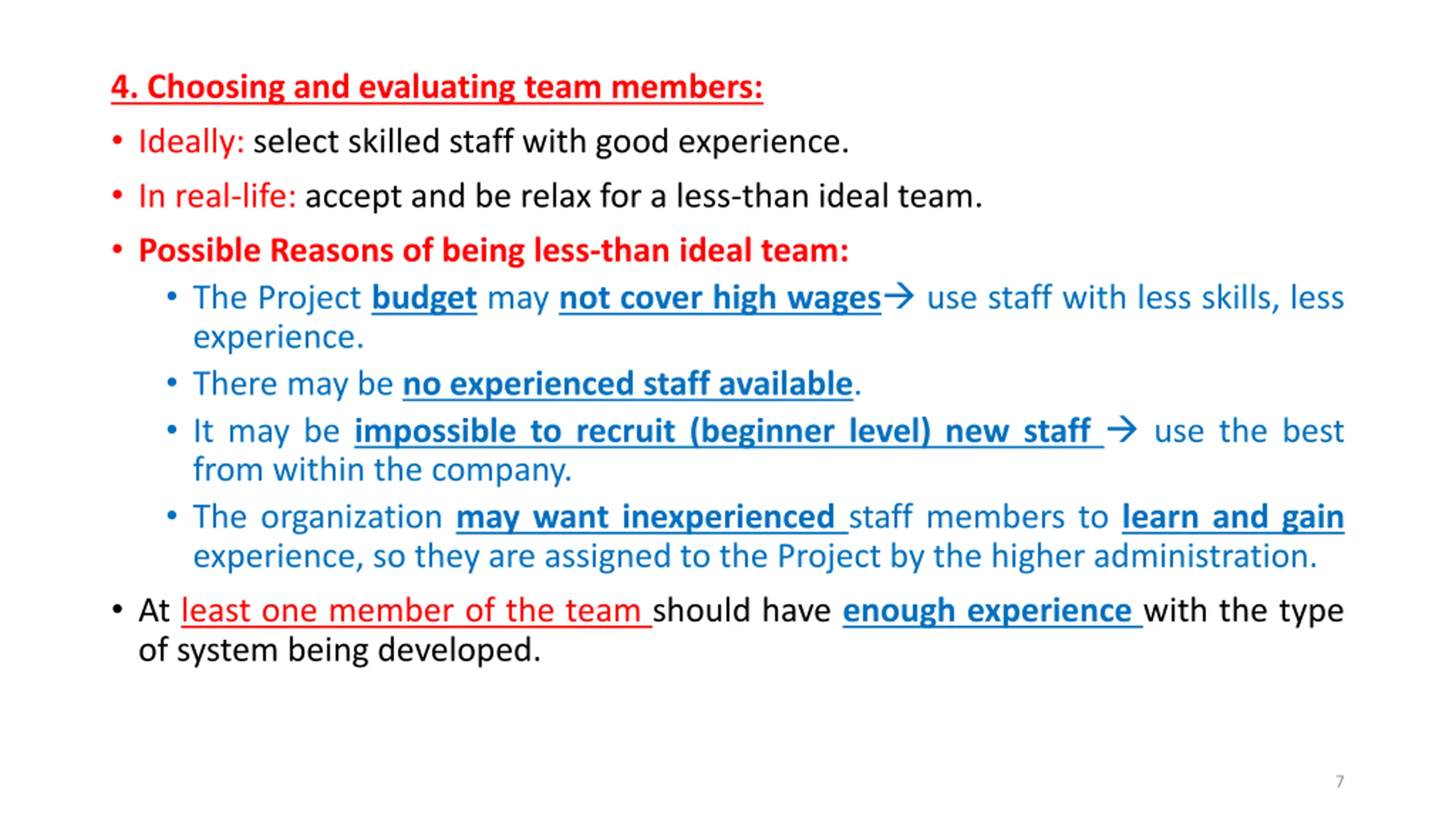 4. Choosing and evaluating team members: Ideally: select skilled staff with good experience. In real-life: accept and be relax for a less-than ideal team. Possible Reasons of being less-than ideal team: The Project budget may not cover high wages use staff with less skills, less experience. There may be no experienced staff available. It may be impossible to recruit (beginner level) new staff use the best from within the company. The organization may want inexperienced staff members to learn and gain experience, so they are assigned to the Project by the higher administration. At least one member of the team should have enough experience with the type of system being developed. 7