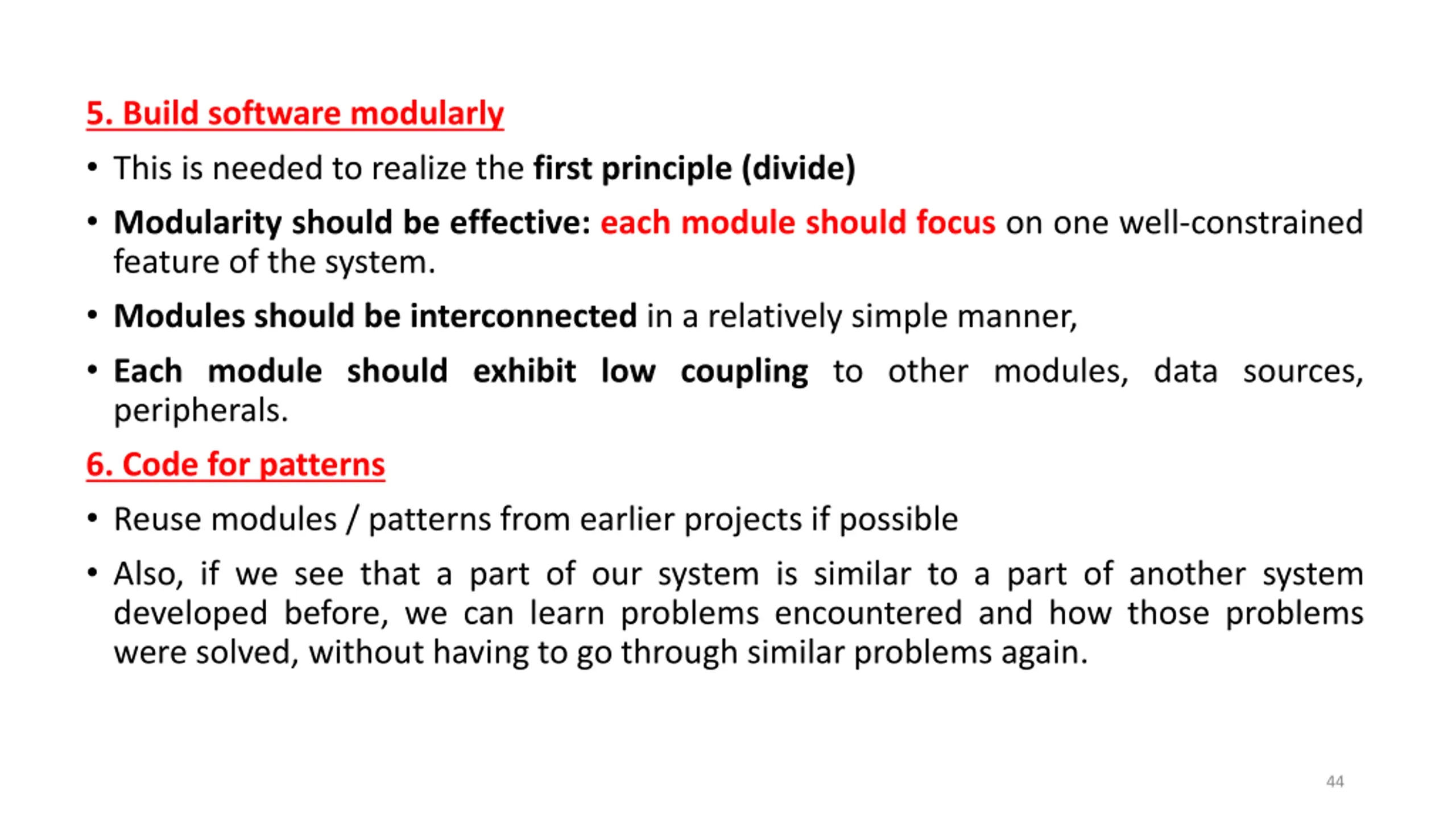 5. Build software modularly This is needed to realize the first principle (divide) Modularity should be effective: each module should focus on one well-constrained feature of the system. Modules should be interconnected in a relatively simple manner, Each module should exhibit low coupling to other modules, data sources, peripherals. 6. Code for patterns Reuse modules / patterns from earlier projects if possible Also, if we see that a part of our system is similar to a part of another system developed before, we can learn problems encountered and how those problems were solved, without having to go through similar problems again. 44