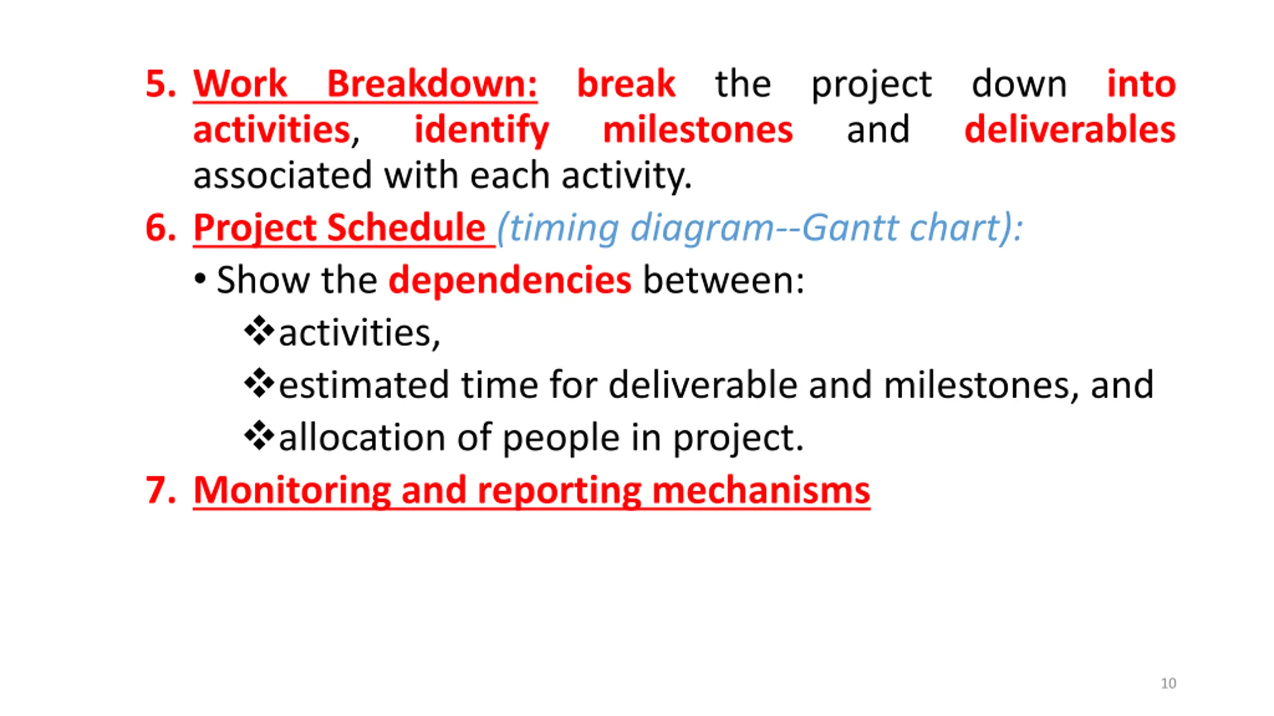 5. Work Breakdown: break the project down into activities, identify milestones associated with each activity. 6. Project Schedule (timing diagram--Gantt chart): Show the dependencies between: activities, estimated time for deliverable and milestones, and allocation of people in project. 7. Monitoring and reporting mechanisms and deliverables 10