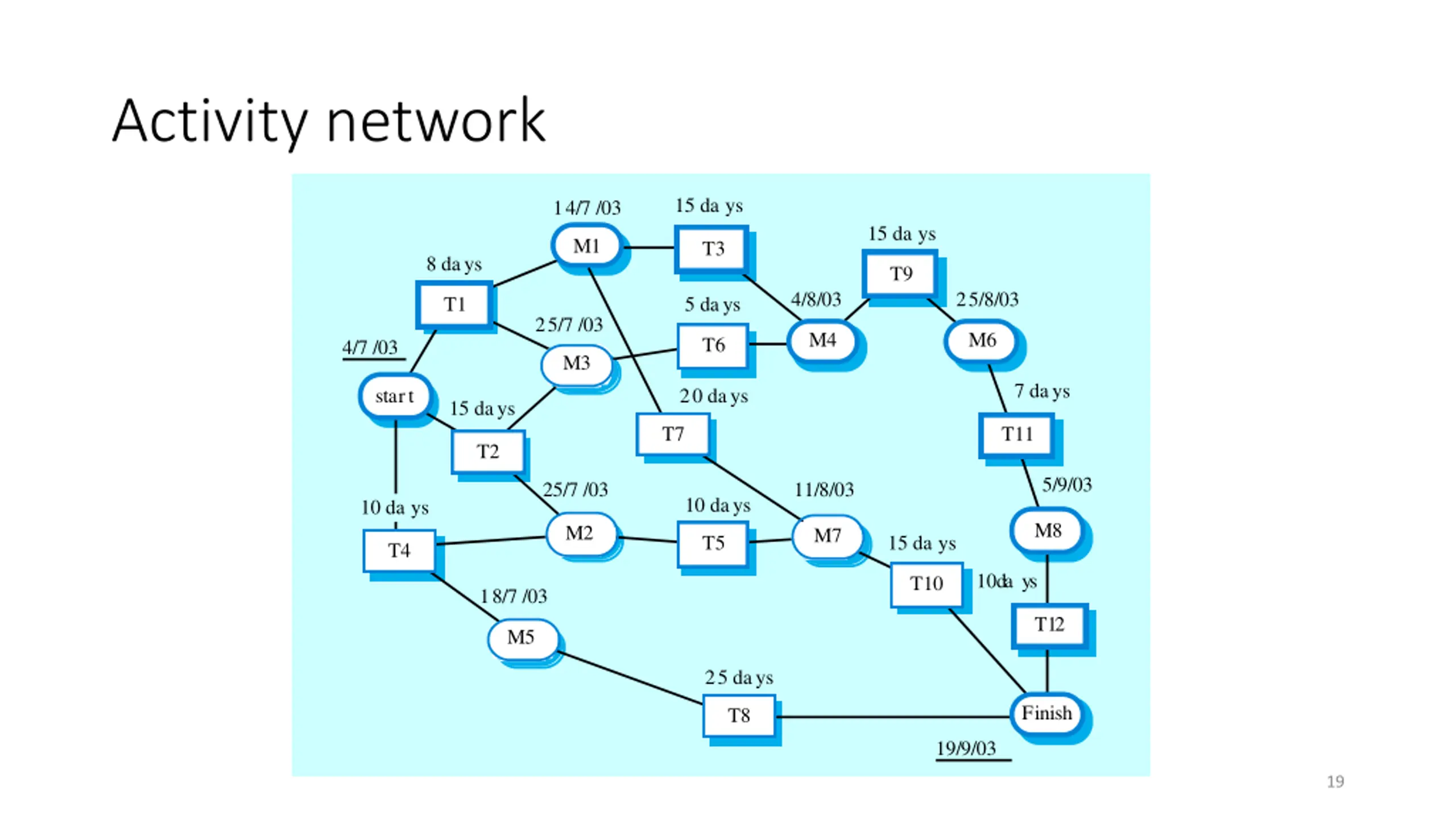 Activity network 15 da ys 14/7 /03 15 da ys M1 T3 8 days T9 4/8/03 25/8/03 T1 5 days 25/7 /03 M4 M6 T6 4/7 /03 M3 7 days start 20 days 15 days T7 T11 T2 5/9/03 25/7 /03 11/8/03 10 days 10 da ys M8 M2 M7 T5 15 da ys T4 10 da ys T10 18/7 /03 T12 M5 25 days Finish T8 19/9/03 19