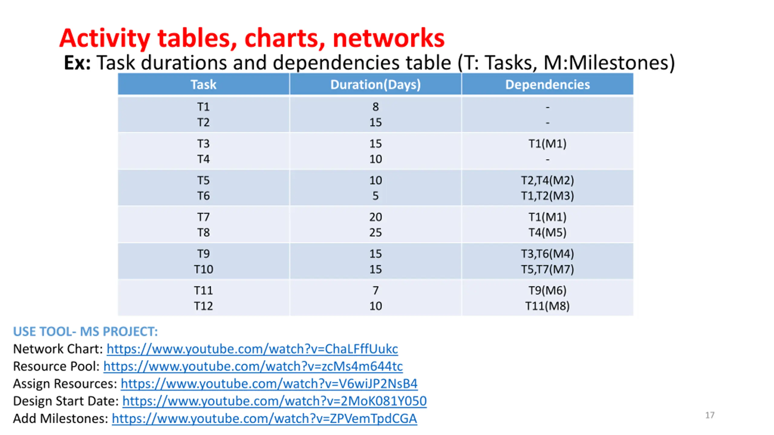 Activity tables, charts, networks Ex: Task durations and dependencies table (T: Tasks, M:Milestones) Task Duration(Days) Dependencies T1 T2 8 - - 15 T3 T4 15 10 T1(M1) - T5 T6 10 5 T2,T4(M2) T1,T2(M3) T7 T8 20 25 T1(M1) T4(M5) T9 T10 15 15 T3,T6(M4) T5,T7(M7) T11 T12 7 T9(M6) T11(M8) 10 USE TOOL- MS PROJECT: Network Chart: https://www.youtube.com/watch?v=ChaLFffUukc Resource Pool: https://www.youtube.com/watch?v=zcMs4m644tc Assign Resources: https://www.youtube.com/watch?v=V6wiJP2NsB4 Design Start Date: https://www.youtube.com/watch?v=2MoK081Y050 Add Milestones: https://www.youtube.com/watch?v=ZPVemTpdCGA 17