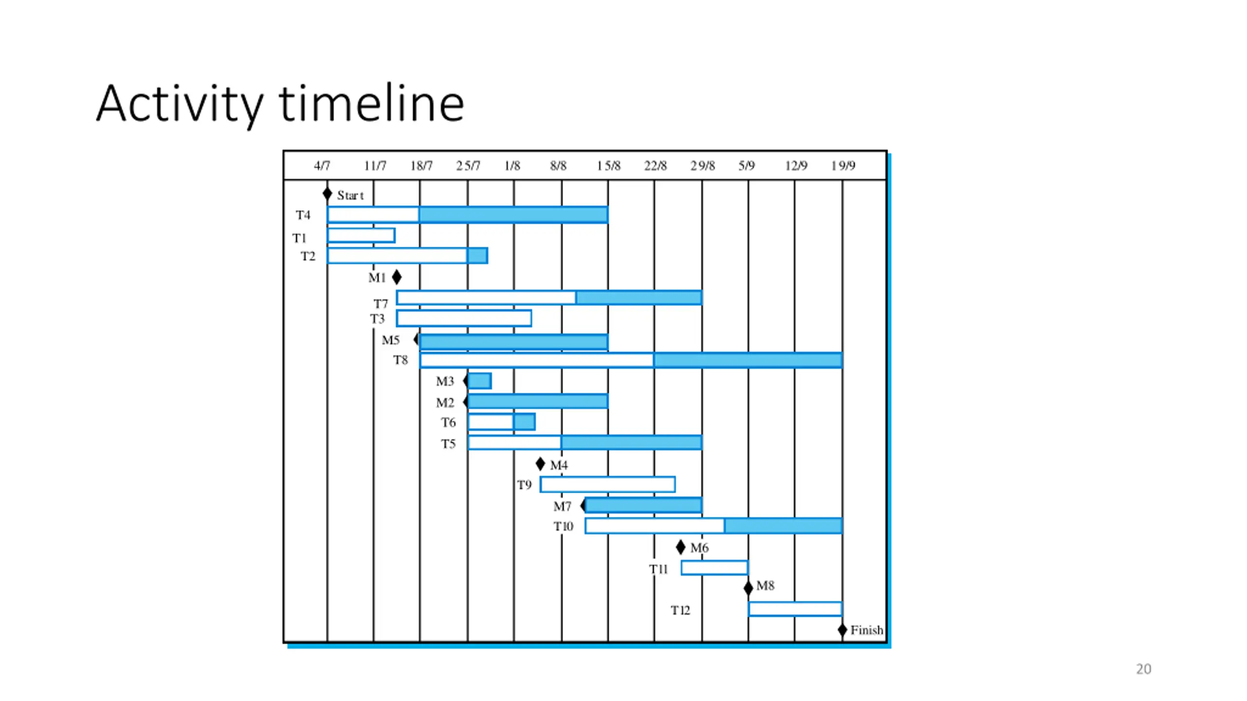 Activity timeline 4/7 11/7 18/7 25/7 1/8 8/8 15/8 22/8 29/8 5/9 12/9 19/9 Start T4 T1 T2 M1 T7 T3 M5 T8 M3 M2 T6 T5 M4 T9 M7 T10 M6 T11 M8 T12 Finish 20
