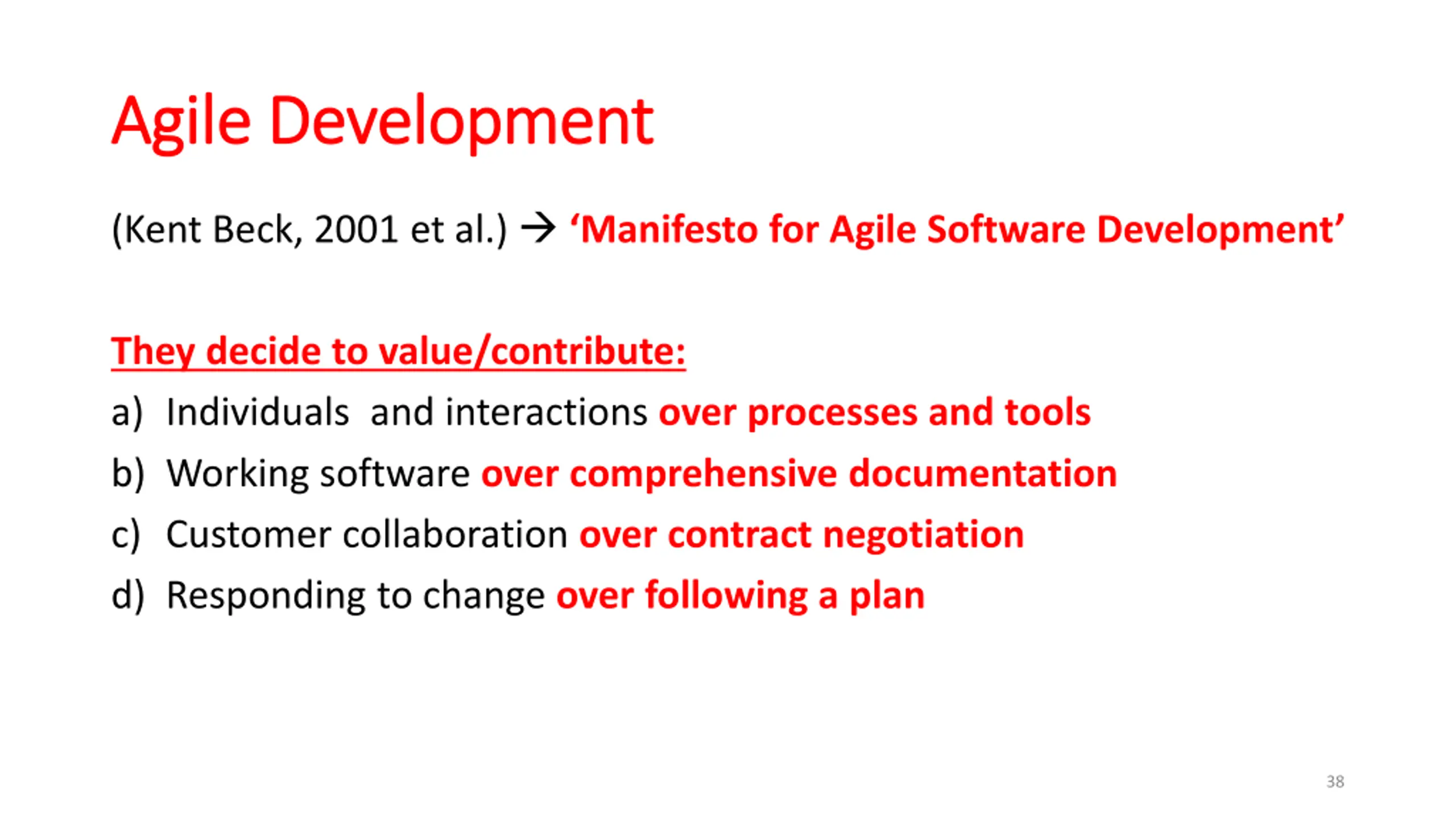 Agile Development Agile Development (Kent Beck, 2001 et al.) Manifesto for Agile Software Development They decide to value/contribute: a) Individuals and interactions over processes and tools b) Working software over comprehensive documentation c) Customer collaboration over contract negotiation d) Responding to change over following a plan 38