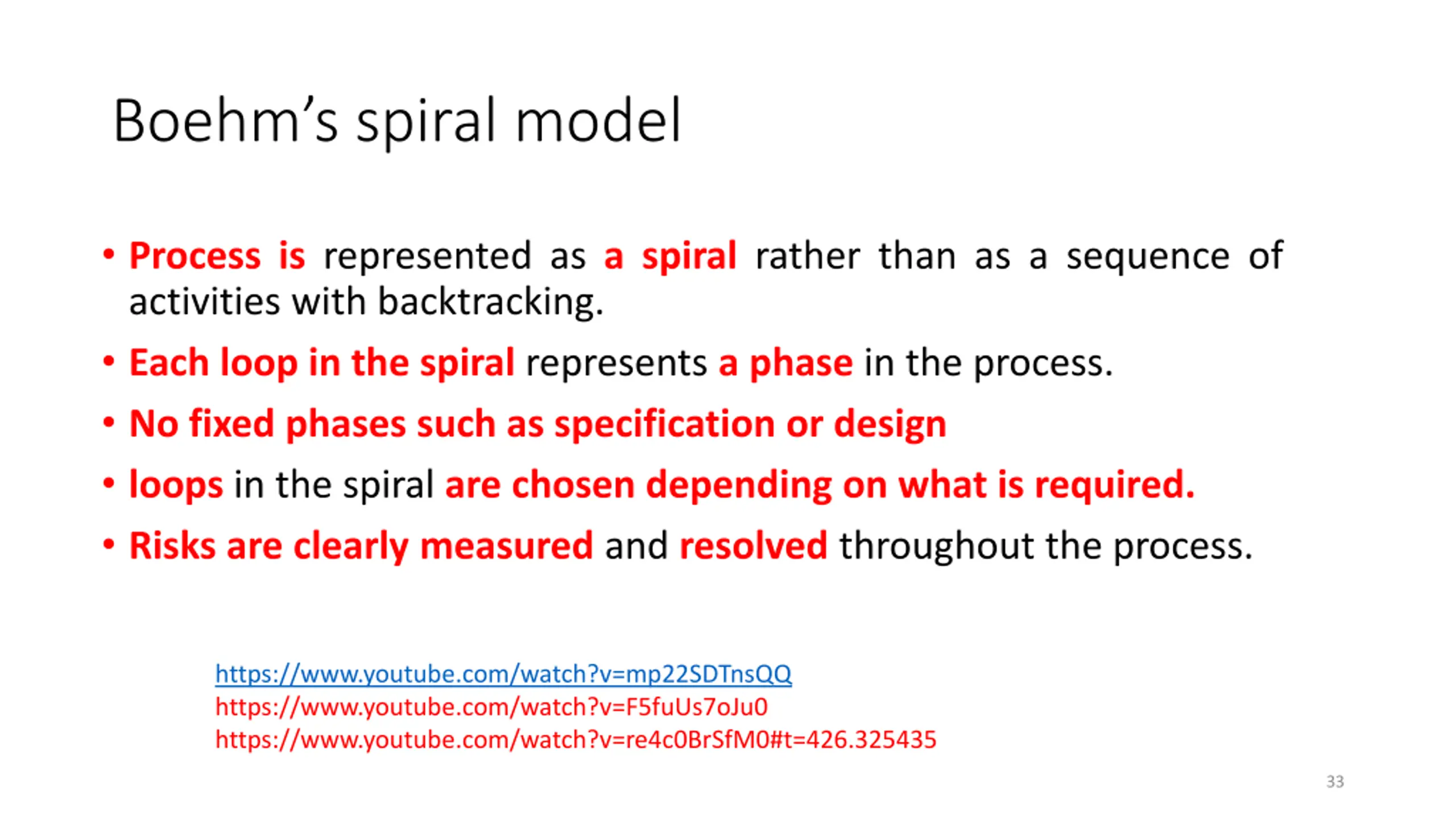 Boehms spiral model Process is represented as a spiral rather than as a sequence of activities with backtracking. Each loop in the spiral represents a phase in the process. No fixed phases such as specification or design loops in the spiral are chosen depending on what is required. Risks are clearly measured and resolved throughout the process. https://www.youtube.com/watch?v=mp22SDTnsQQ https://www.youtube.com/watch?v=F5fuUs7oJu0 https://www.youtube.com/watch?v=re4c0BrSfM0#t=426.325435 33