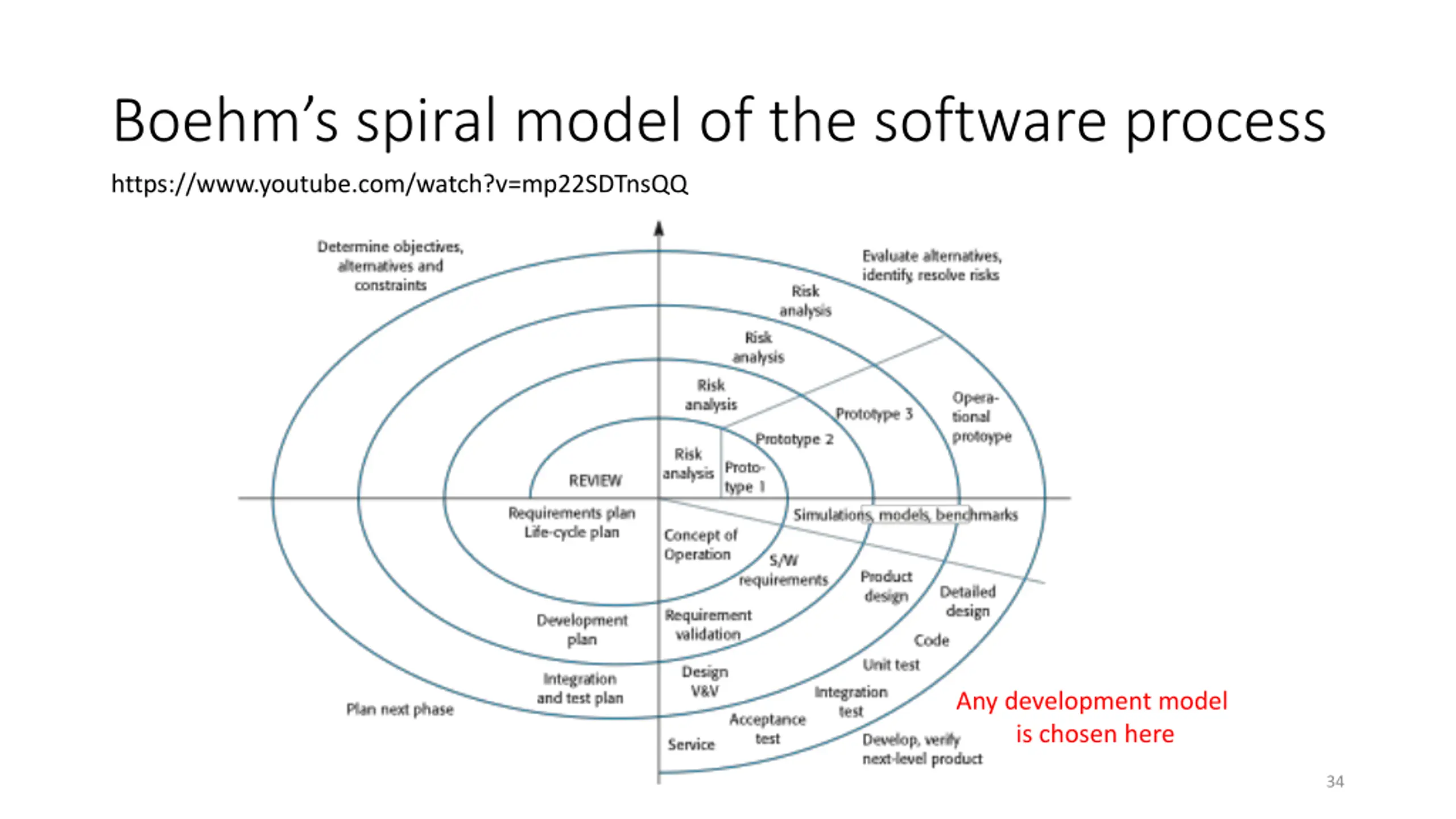 Boehms spiral model of the software process https://www.youtube.com/watch?v=mp22SDTnsQQ Any development model is chosen here 34