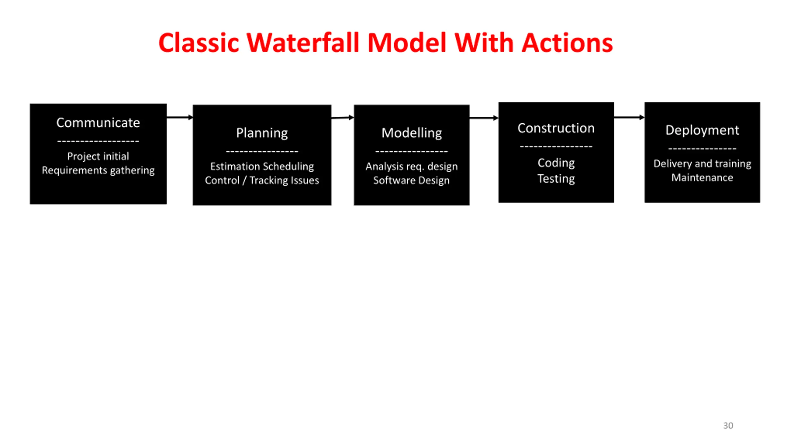 Classic Waterfall Model With Actions Communicate ------------------ Project initial Requirements gathering Construction ---------------- Coding Testing Deployment --------------- Delivery and training Maintenance Planning ---------------- Estimation Scheduling Control / Tracking Issues Modelling ---------------- Analysis req. design Software Design 30