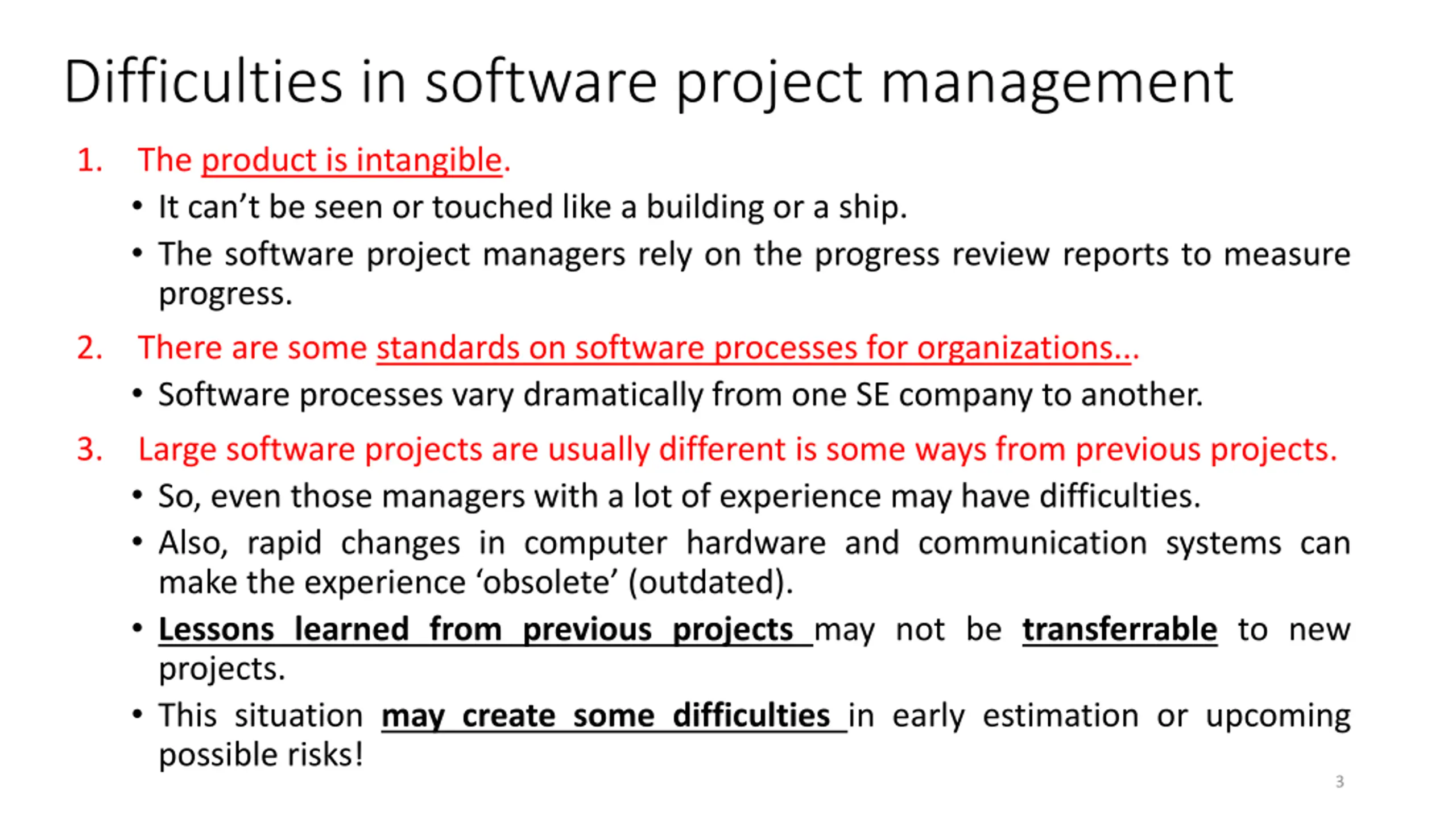 Difficulties in software project management 1. The product is intangible. It can t be seen or touched like a building or a ship. The software project managers rely on the progress review reports to measure progress. There are some standards on software processes for organizations... Software processes vary dramatically from one SE company to another. Large software projects are usually different is some ways from previous projects. So, even those managers with a lot of experience may have difficulties. Also, rapid changes in computer hardware and communication systems can make the experience obsolete (outdated). Lessons learned from previous projects may not be transferrable to new projects. This situation may create some difficulties in early estimation or upcoming possible risks! 2. 3. 3