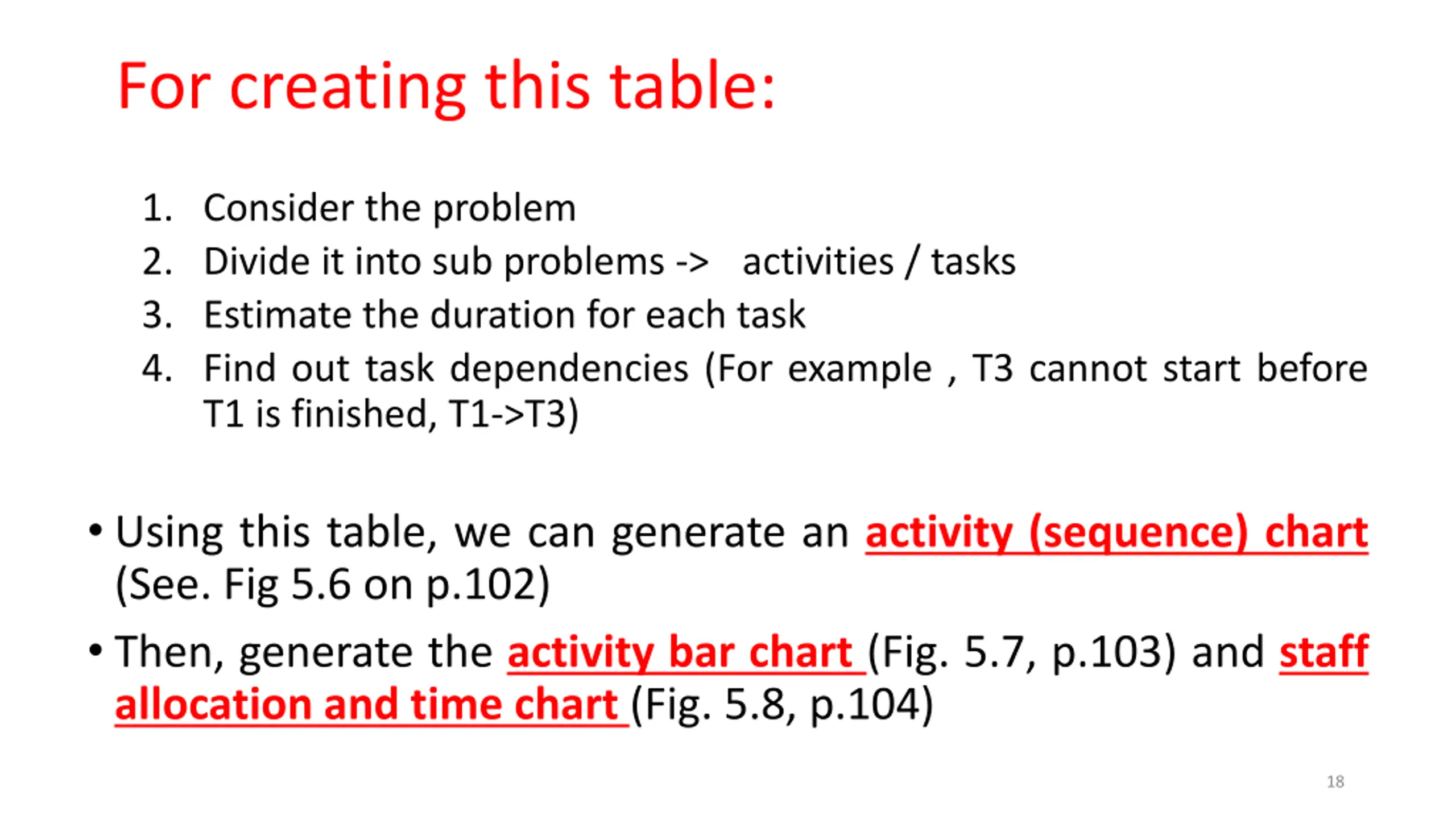 For creating this table: 1. Consider the problem 2. Divide it into sub problems -> activities / tasks 3. Estimate the duration for each task 4. Find out task dependencies (For example , T3 cannot start before T1 is finished, T1->T3) Using this table, we can generate an activity (sequence) chart (See. Fig 5.6 on p.102) Then, generate the activity bar chart (Fig. 5.7, p.103) and staff allocation and time chart (Fig. 5.8, p.104) 18