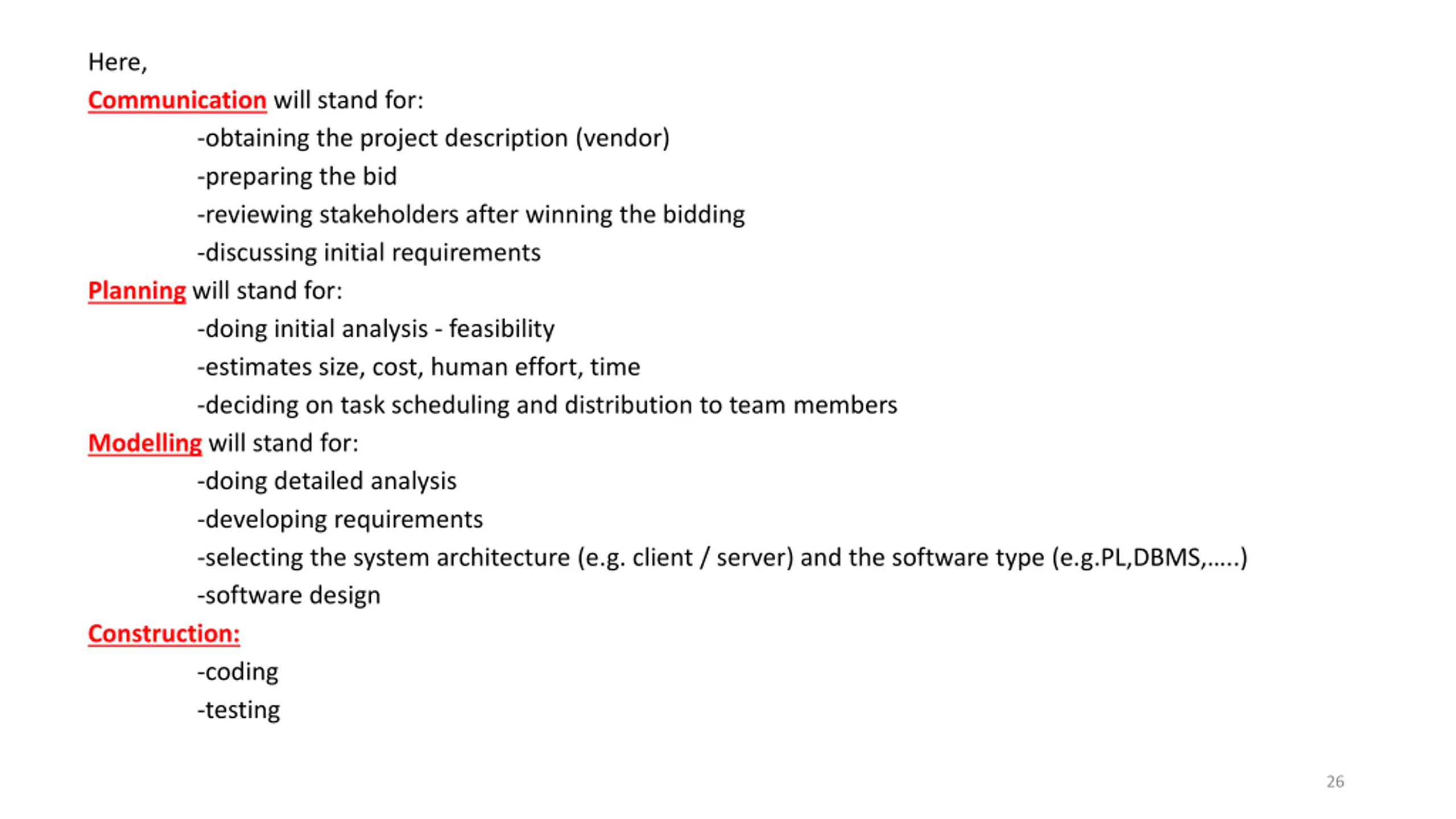 Here, Communication will stand for: -obtaining the project description (vendor) -preparing the bid -reviewing stakeholders after winning the bidding -discussing initial requirements Planning will stand for: -doing initial analysis - feasibility -estimates size, cost, human effort, time -deciding on task scheduling and distribution to team members Modelling will stand for: -doing detailed analysis -developing requirements -selecting the system architecture (e.g. client / server) and the software type (e.g.PL,DBMS, ..) -software design Construction: -coding -testing 26