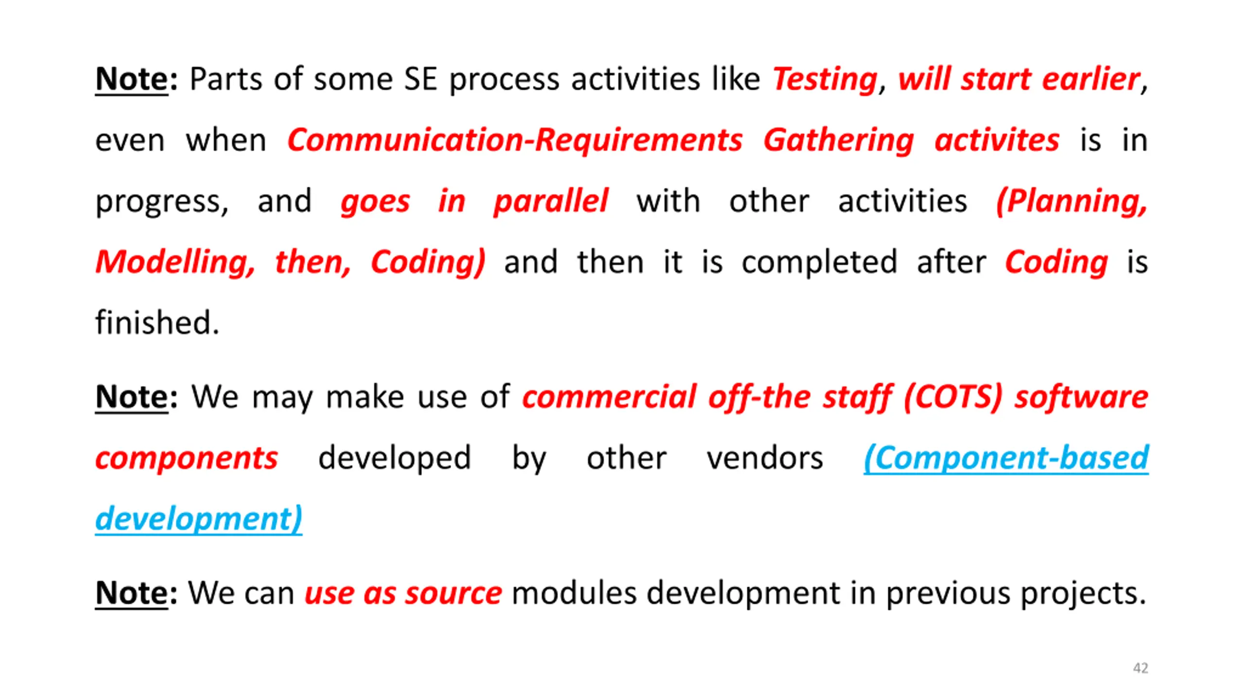 Note: Parts of some SE process activities like Testing, will start earlier, even when Communication-Requirements Gathering activites is in progress, and goes in parallel with other activities (Planning, Modelling, then, Coding) and then it is completed after Coding is finished. Note: We may make use of commercial off-the staff (COTS) software components developed by other vendors (Component-based development) Note: We can use as source modules development in previous projects. 42