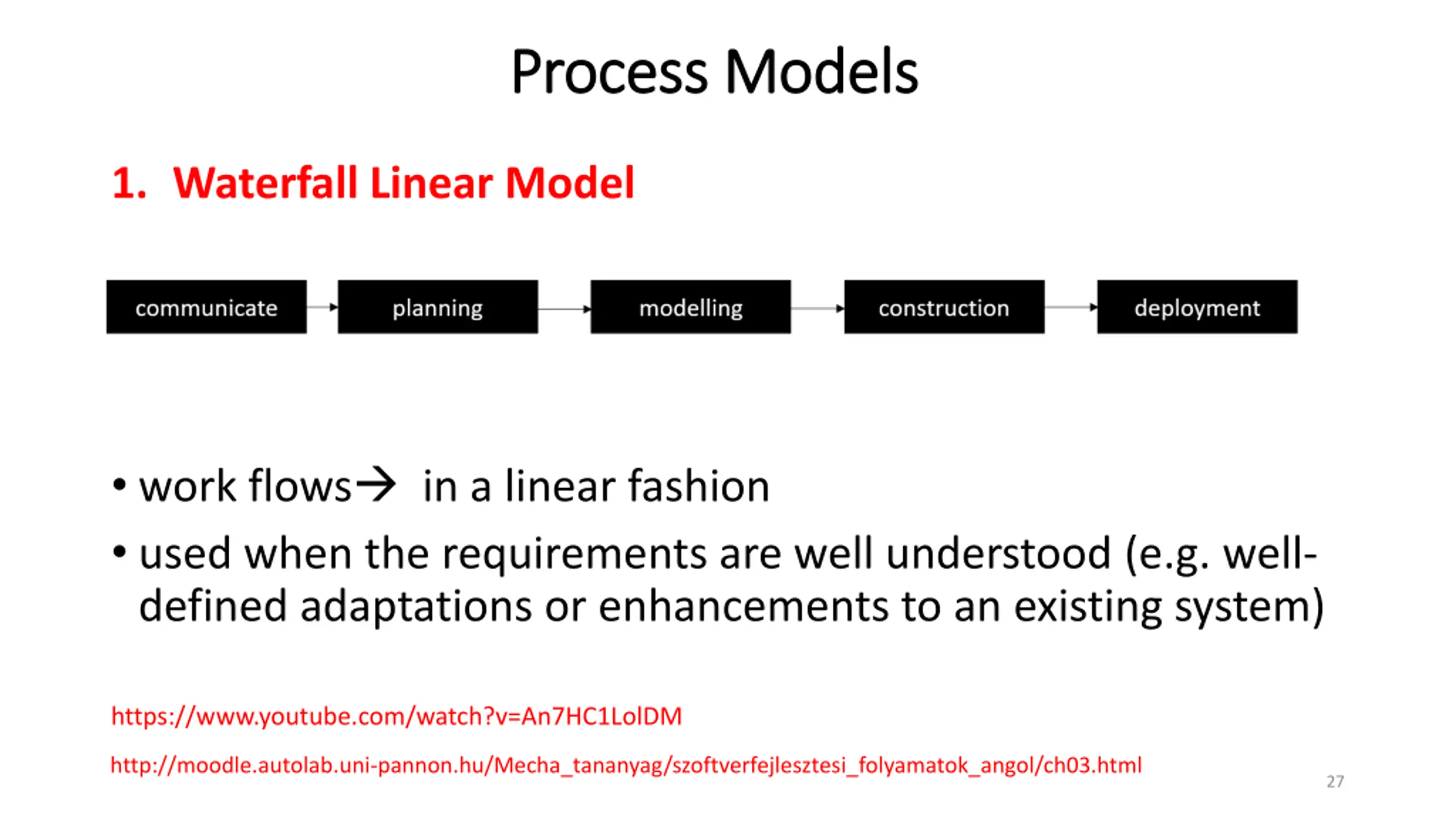 Process Models Process Models 1. Waterfall Linear Model work flows in a linear fashion used when the requirements are well understood (e.g. well- defined adaptations or enhancements to an existing system) https://www.youtube.com/watch?v=An7HC1LolDM http://moodle.autolab.uni-pannon.hu/Mecha_tananyag/szoftverfejlesztesi_folyamatok_angol/ch03.html 27