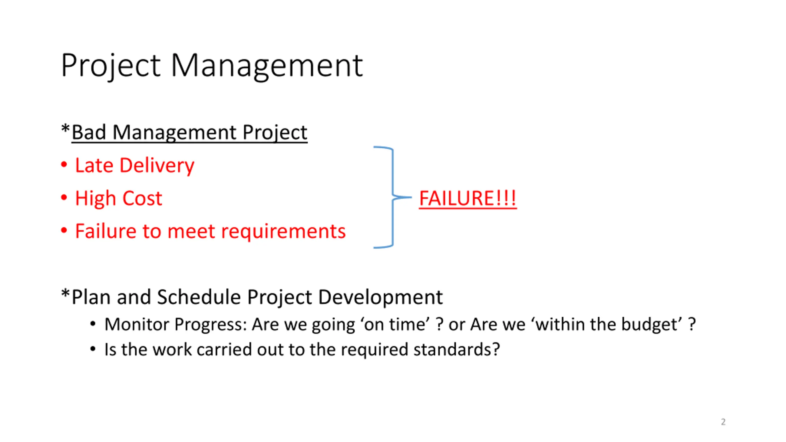 Project Management *Bad Management Project Late Delivery High Cost Failure to meet requirements FAILURE!!! *Plan and Schedule Project Development Monitor Progress: Are we going on time ? or Are we within the budget ? Is the work carried out to the required standards? 2