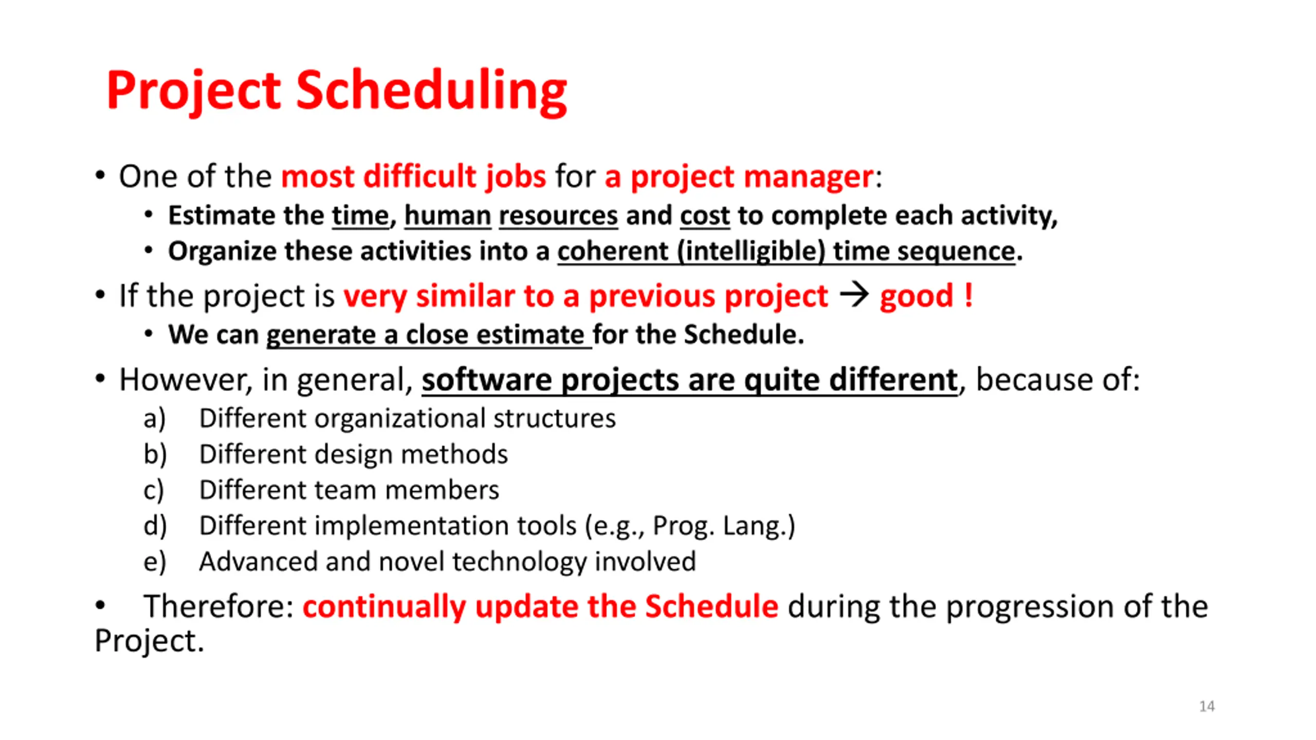 Project Scheduling One of the most difficult jobs for a project manager: Estimate the time, human resources and cost to complete each activity, Organize these activities into a coherent (intelligible) time sequence. If the project is very similar to a previous project good ! We can generate a close estimate for the Schedule. However, in general, software projects are quite different, because of: a) Different organizational structures b) Different design methods c) Different team members d) Different implementation tools (e.g., Prog. Lang.) e) Advanced and novel technology involved Therefore: continually update the Schedule during the progression of the Project. 14