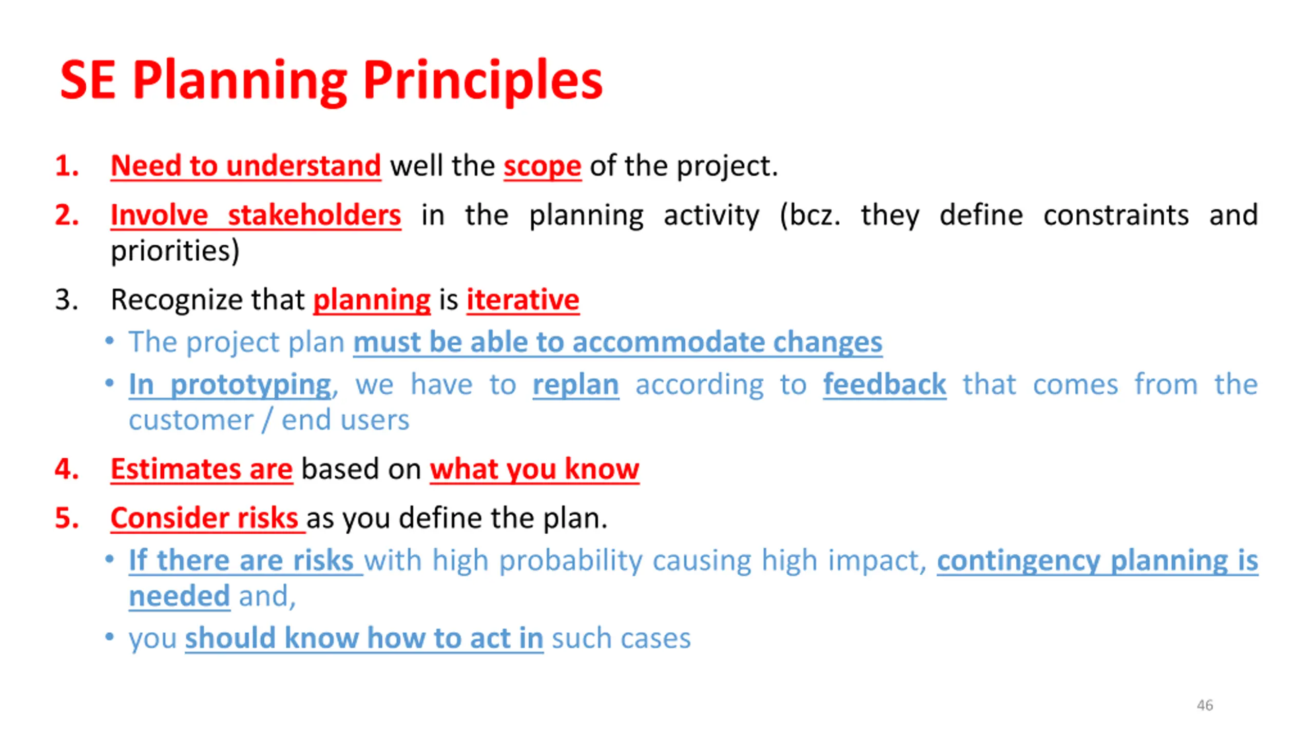SE Planning Principles 1. Need to understand well the scope of the project. 2. Involve stakeholders in the planning activity (bcz. they define constraints and priorities) Recognize that planning is iterative The project plan must be able to accommodate changes In prototyping, we have to replan according to feedback that comes from the customer / end users 3. 4. 5. Estimates are based on what you know Consider risks as you define the plan. If there are risks with high probability causing high impact, contingency planning is needed and, you should know how to act in such cases 46