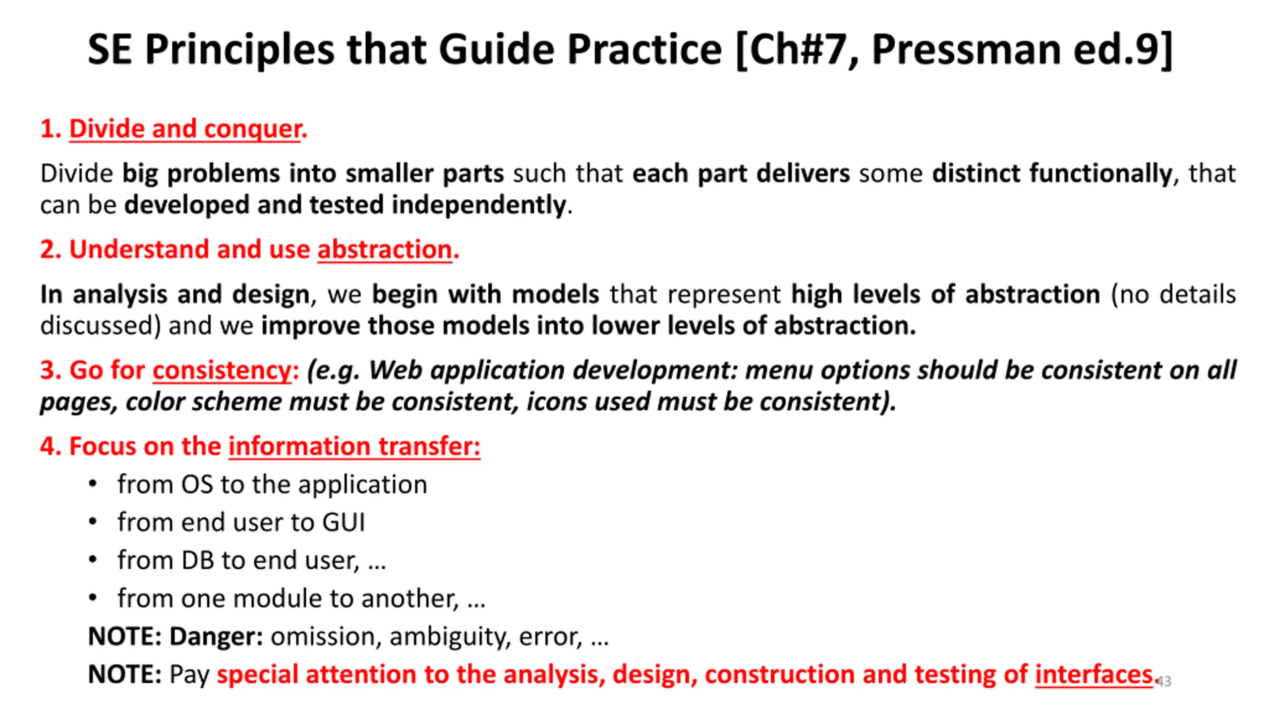 SE Principles that Guide Practice [Ch#7, Pressman ed.9] 1. Divide and conquer. Divide big problems into smaller parts such that each part delivers some distinct functionally, that can be developed and tested independently. 2. Understand and use abstraction. In analysis and design, we begin with models that represent high levels of abstraction (no details discussed) and we improve those models into lower levels of abstraction. 3. Go for consistency: (e.g. Web application development: menu options should be consistent on all pages, color scheme must be consistent, icons used must be consistent). 4. Focus on the information transfer: from OS to the application from end user to GUI from DB to end user, from one module to another, NOTE: Danger: omission, ambiguity, error, NOTE: Pay special attention to the analysis, design, construction and testing of interfaces. 43