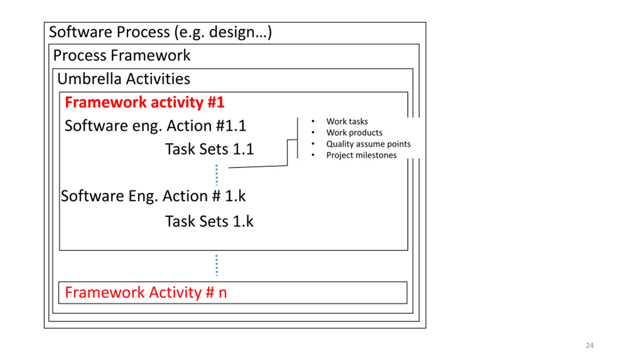Software Process (e.g. design) Process Framework Umbrella Activities Framework activity #1 Software eng. Action #1.1 Task Sets 1.1 Work tasks Work products Quality assume points Project milestones Software Eng. Action # 1.k Task Sets 1.k Framework Activity # n 24