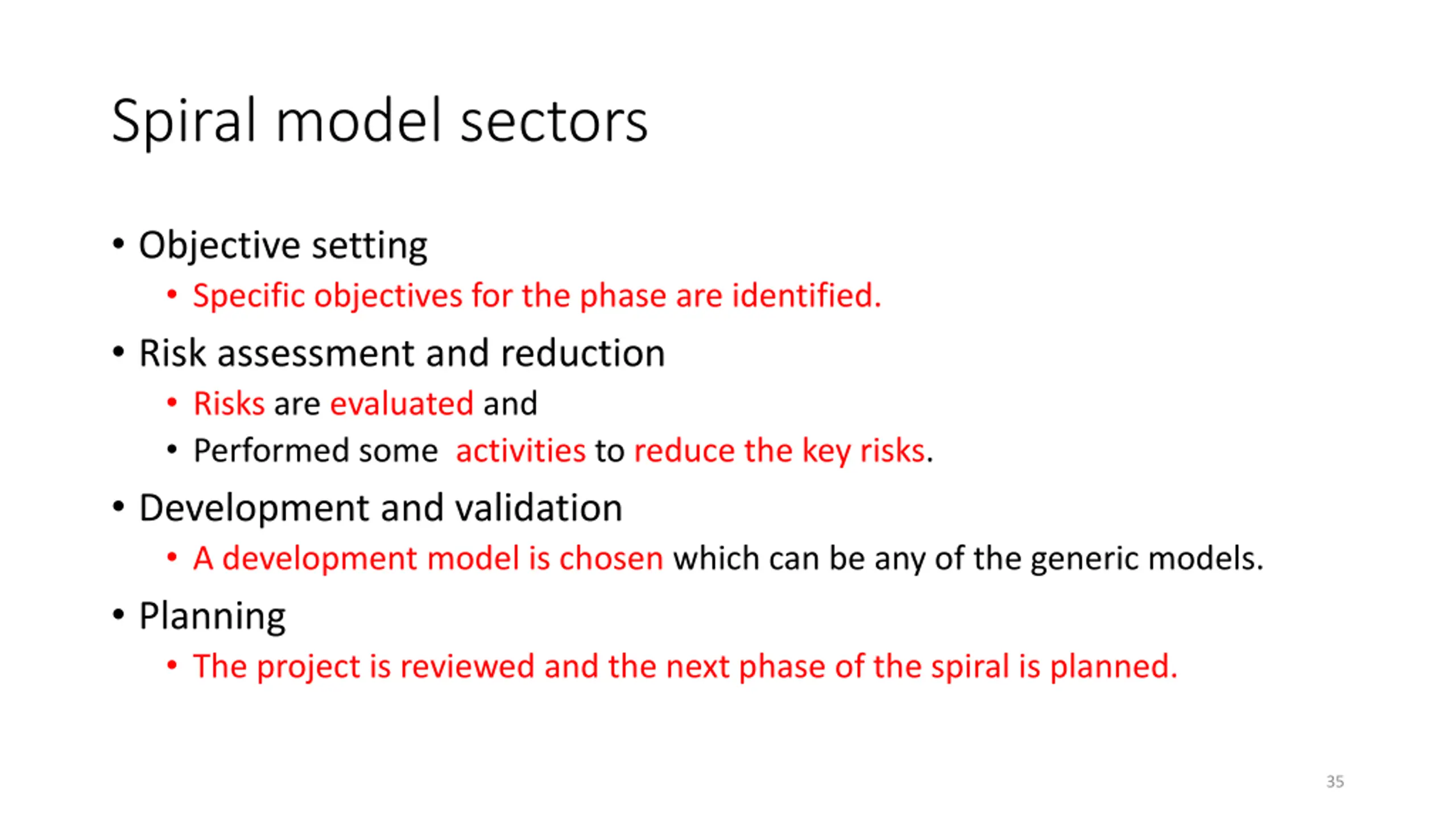 Spiral model sectors Objective setting Specific objectives for the phase are identified. Risk assessment and reduction Risks are evaluated and Performed some activities to reduce the key risks. Development and validation A development model is chosen which can be any of the generic models. Planning The project is reviewed and the next phase of the spiral is planned. 35
