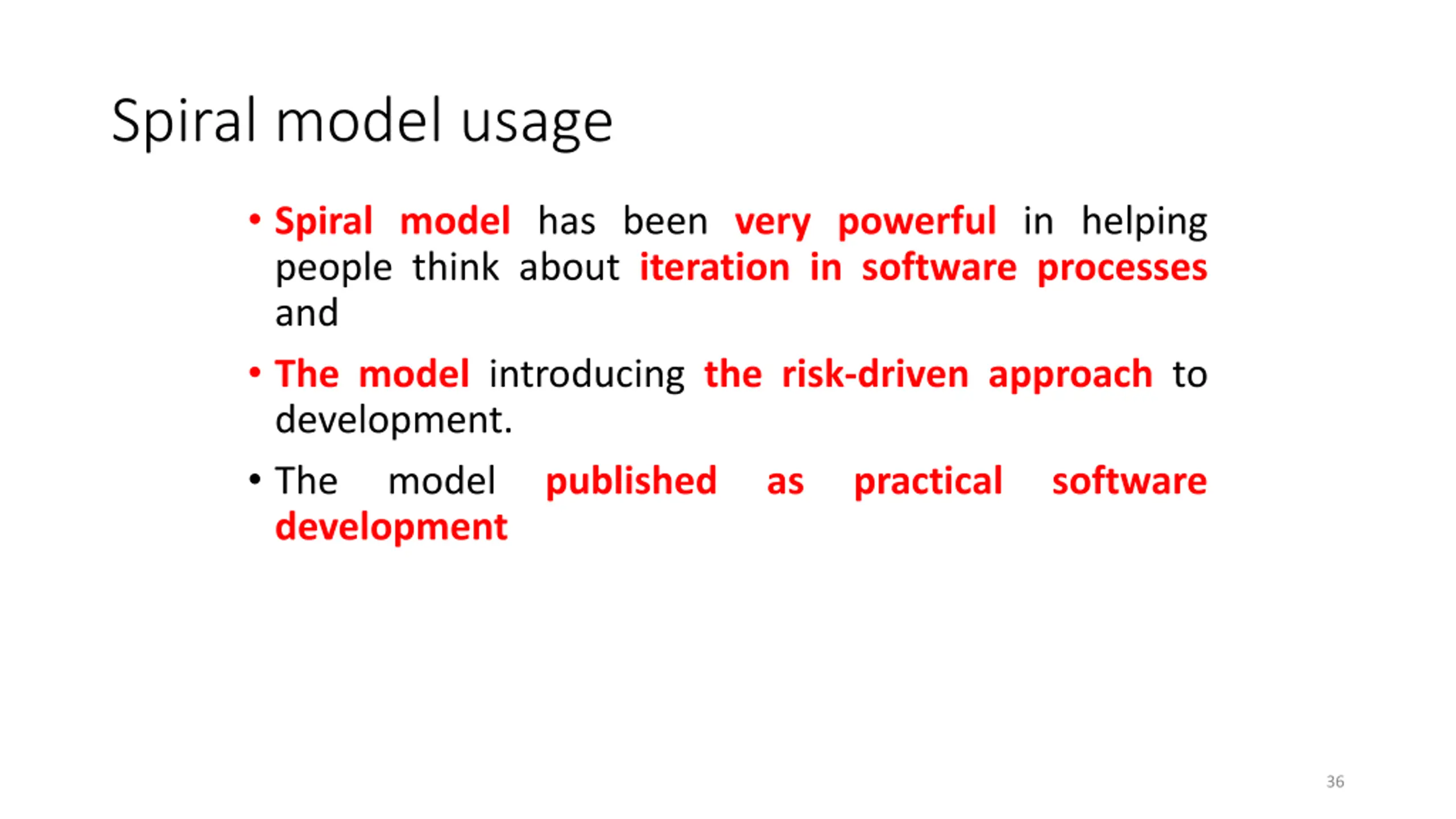 Spiral model usage Spiral model has been very powerful in helping people think about iteration in software processes and The model introducing the risk-driven approach to development. The model published development as practical software 36