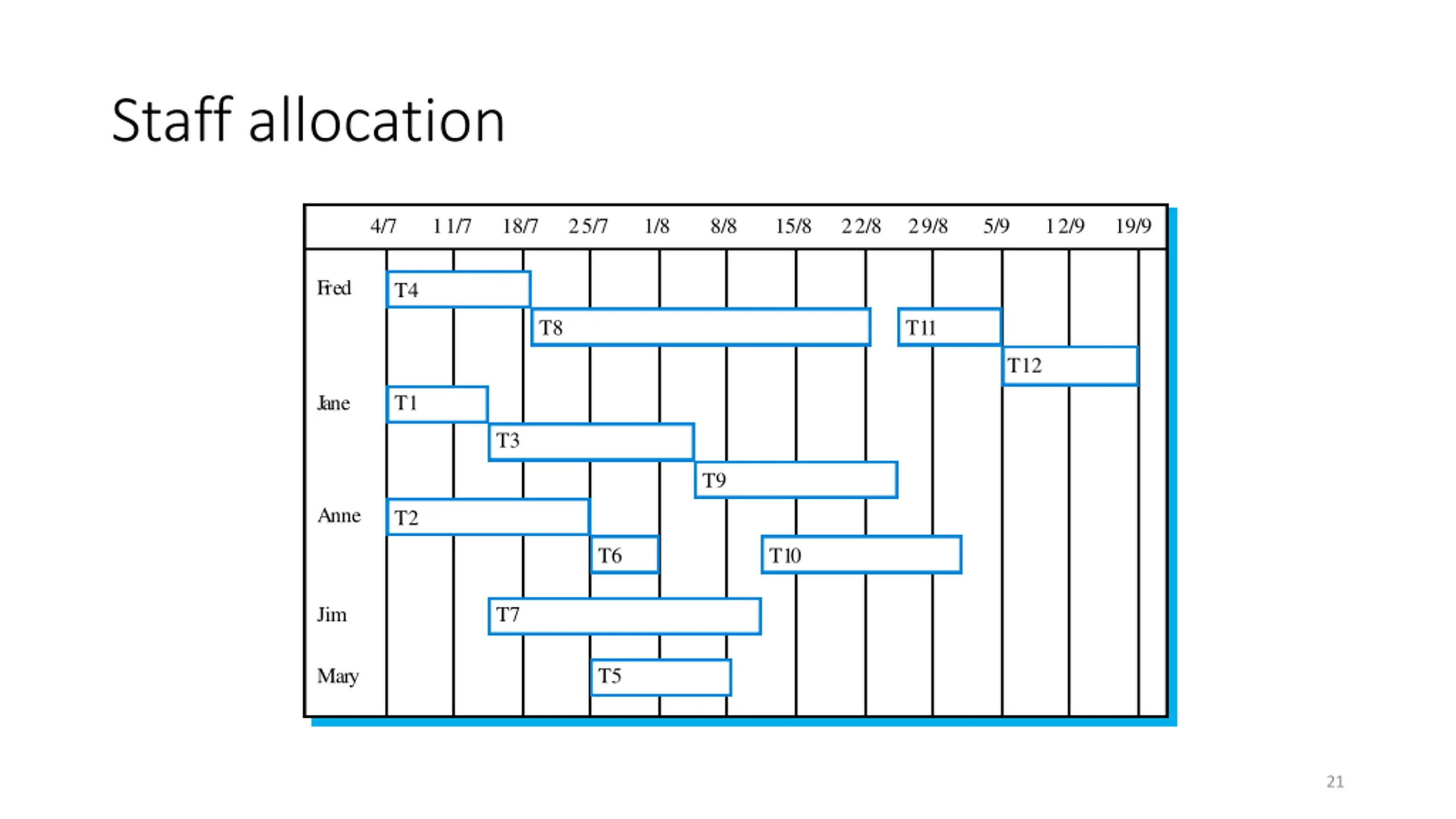 Staff allocation 4/7 11/7 18/7 25/7 1/8 8/8 15/8 22/8 29/8 5/9 12/9 19/9 Fred T4 T8 T11 T12 Jane T1 T3 T9 Anne T2 T6 T10 Jim T7 Mary T5 21