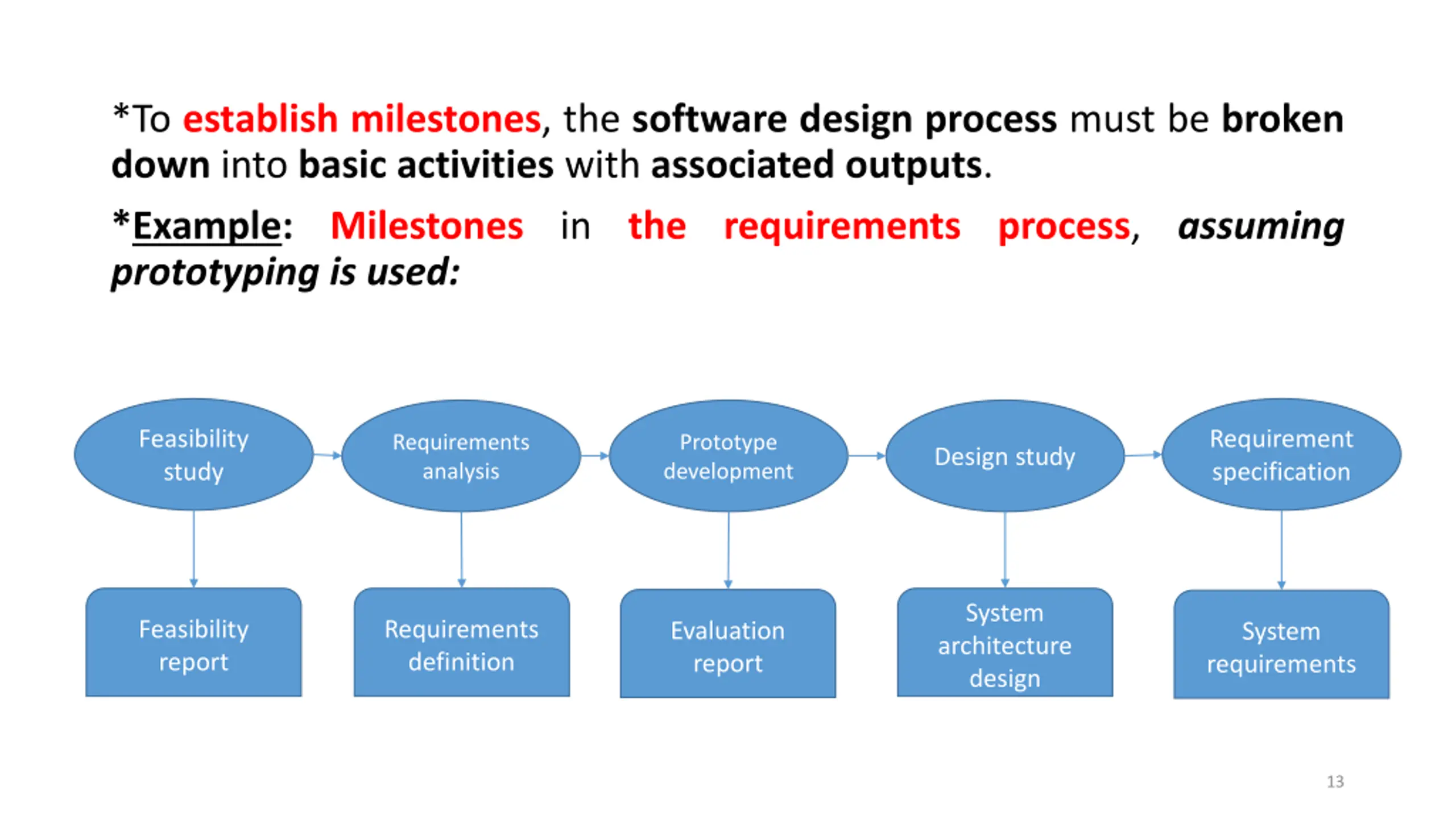 *To establish milestones, the software design process must be broken down into basic activities with associated outputs. *Example: Milestones in the requirements process, assuming prototyping is used: Feasibility study Requirement specification Requirements analysis Prototype development Design study System architecture design Feasibility report Requirements definition Evaluation report System requirements 13
