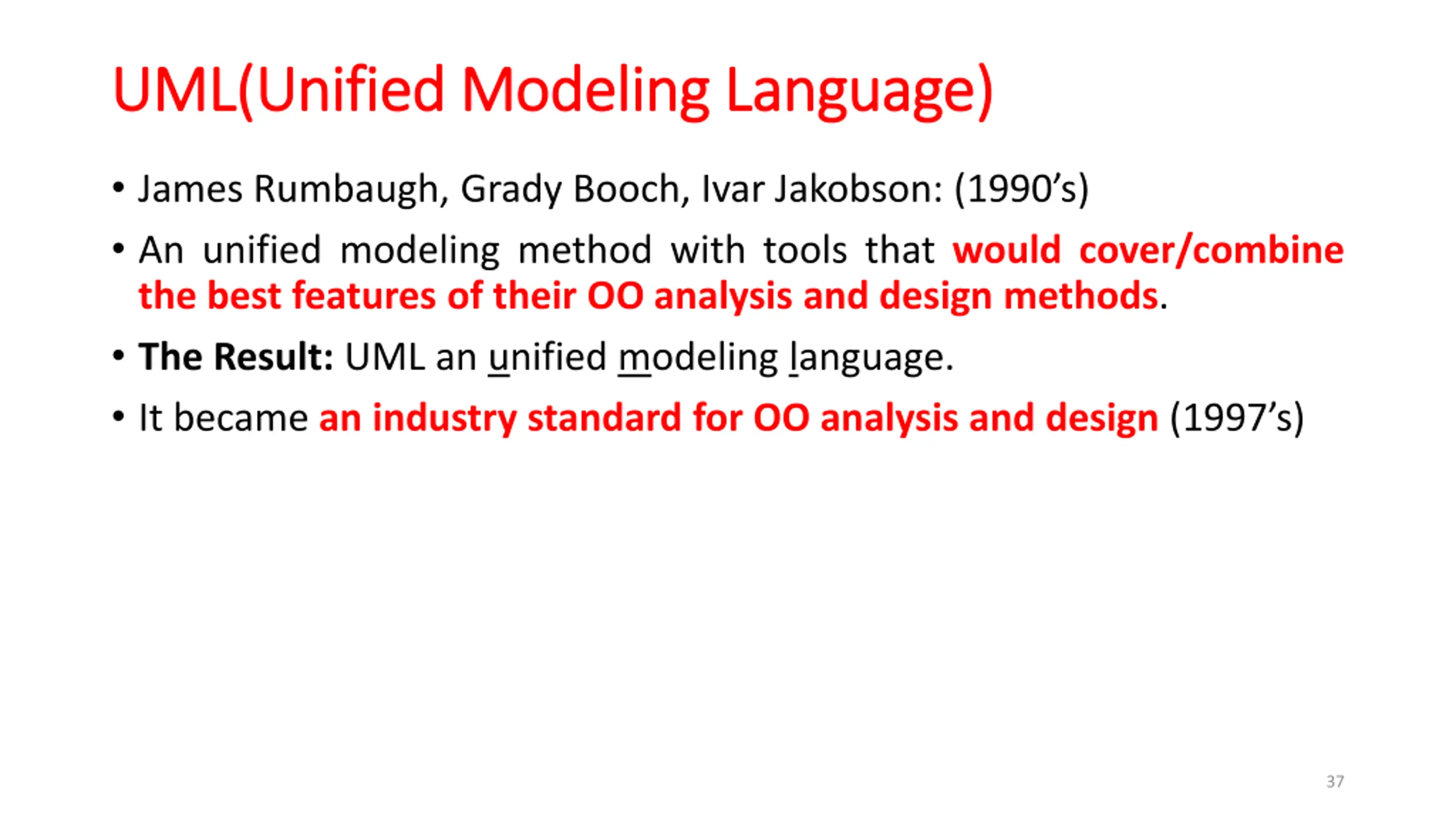 UML( UML(Unified Modeling Language Unified Modeling Language) ) James Rumbaugh, Grady Booch, Ivar Jakobson: (1990 s) An unified modeling method with tools that would cover/combine the best features of their OO analysis and design methods. The Result: UML an unified modeling language. It became an industry standard for OO analysis and design (1997 s) 37