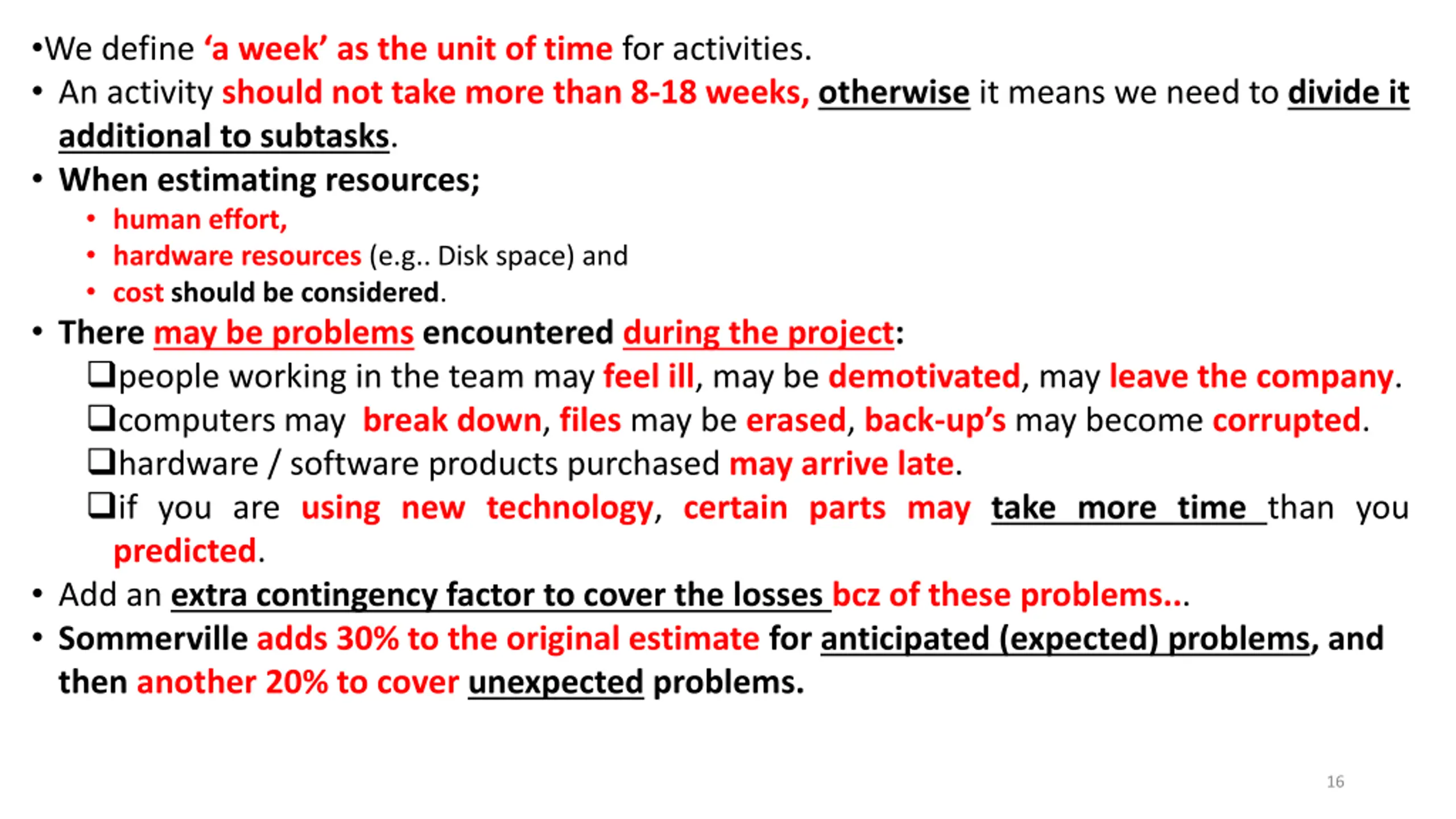 We define aweek as the unit of time for activities. An activity should not take more than 8-18 weeks, otherwise it means we need to divide it additional to subtasks. When estimating resources; human effort, hardware resources (e.g.. Disk space) and costshould be considered. There may be problems encountered during the project: people working in the team may feel ill, may be demotivated, may leave the company. computers may break down, files may be erased, back-up smay become corrupted. hardware / software products purchased may arrive late. if you are using new technology, certain parts may take more time than you predicted. Add an extra contingency factor to cover the losses bcz of these problems... Sommerville adds 30% to the original estimate for anticipated (expected) problems, and then another 20% to cover unexpected problems. 16
