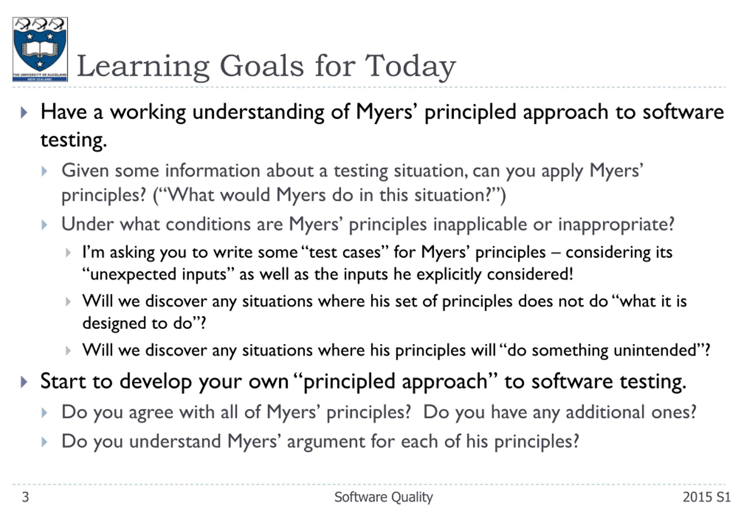 Learning Goals for Today Have a working understanding of Myers principled approach to software testing. Given some information about a testing situation, can you apply Myers principles? ( What would Myers do in this situation? ) Under what conditions are Myers principles inapplicable or inappropriate? Note that I m asking you to write some test cases for Myers principles considering its unexpected inputs as well as the inputs he explicitly considered! 16 Software Quality 2015 S1