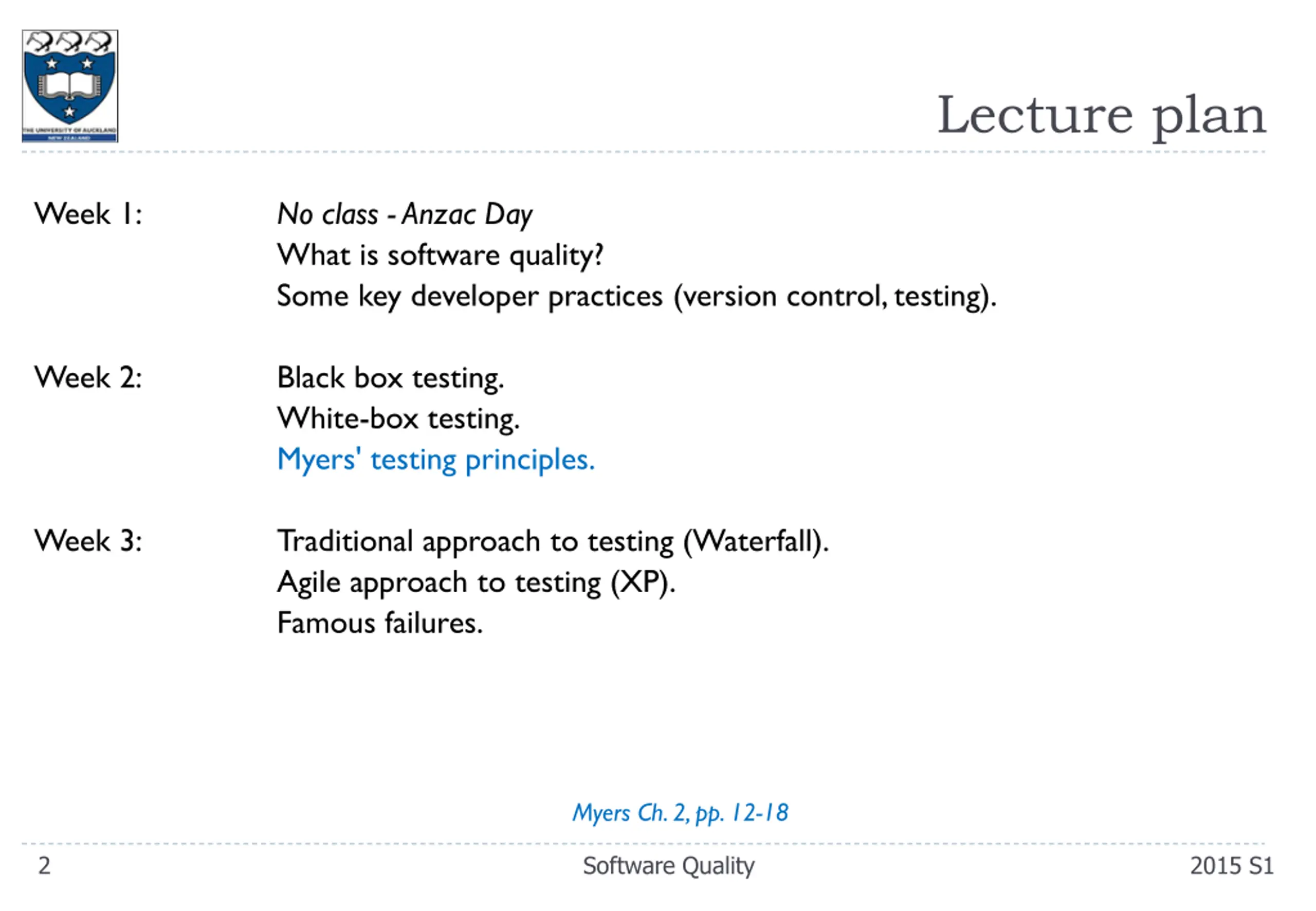 Lecture plan Week 1: No class -Anzac Day What is software quality? Some key developer practices (version control, testing). Week 2: Black box testing. White-box testing. Myers' testing principles. Week 3: Traditional approach to testing (Waterfall). Agile approach to testing (XP). Famous failures. Myers Ch. 2, pp. 12-18 2 Software Quality 2015 S1
