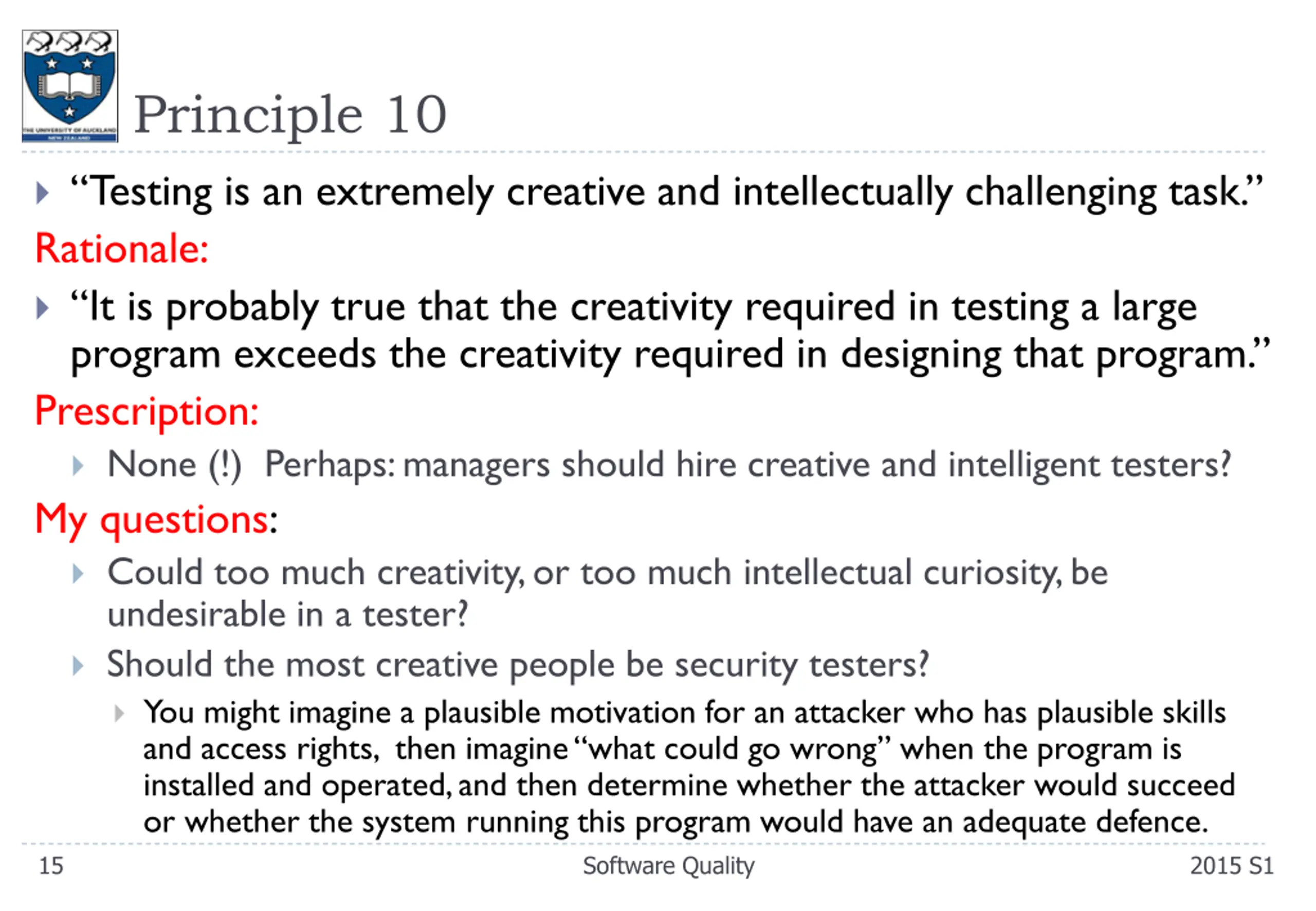 Principle 10 Testing is an extremely creative and intellectually challenging task. Rationale: It is probably true that the creativity required in testing a large program exceeds the creativity required in designing that program. Prescription: None (!) Perhaps: managers should hire creative and intelligent testers? My questions: Could too much creativity, or too much intellectual curiosity, be undesirable in a tester? Should the most creative people be security testers? You might imagine a plausible motivation for an attacker who has plausible skills and access rights, then imagine what could go wrong when the program is installed and operated, and then determine whether the attacker would succeed or whether the system running this program would have an adequate defence. 15 Software Quality 2015 S1