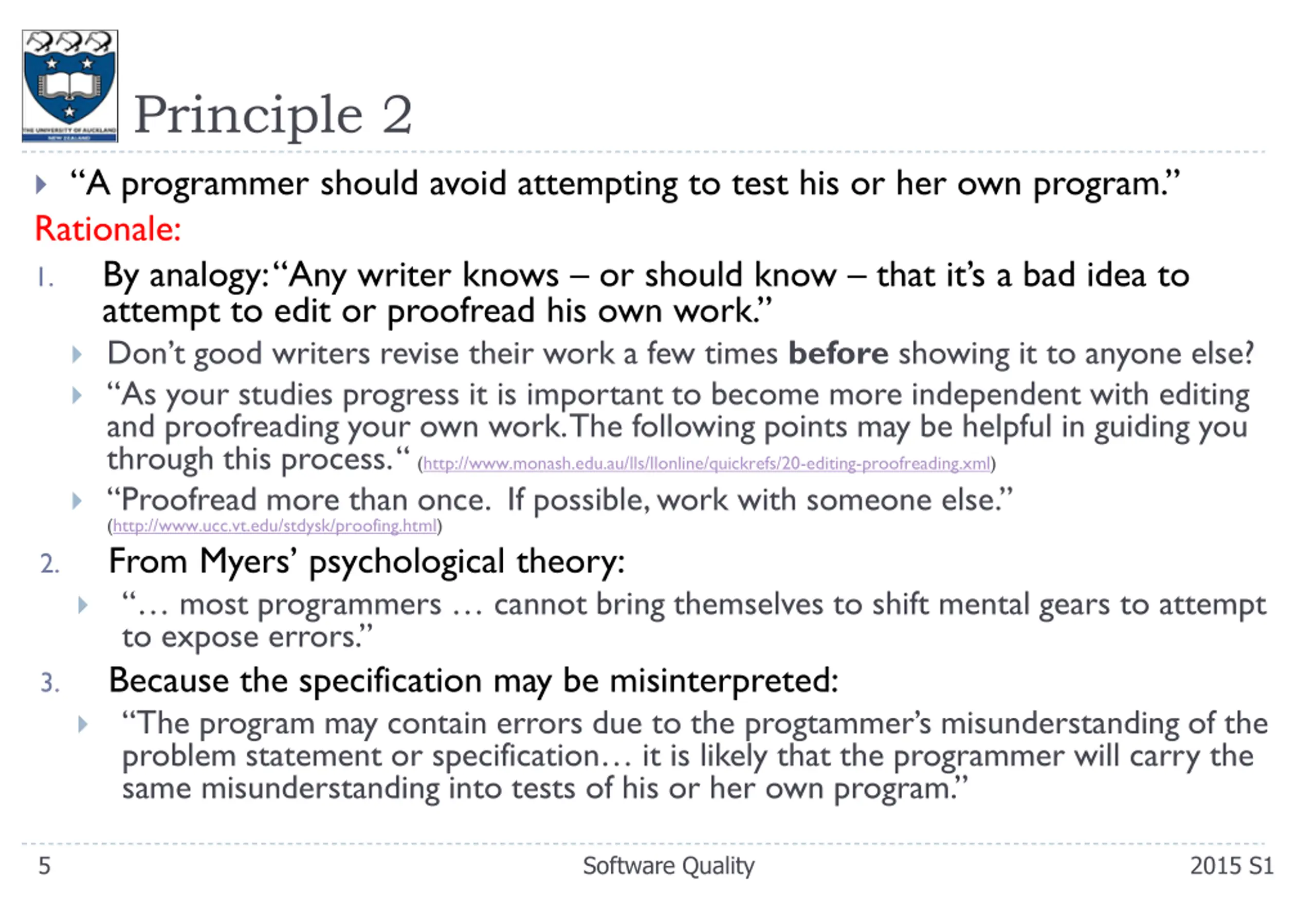 Principle 2 A programmer should avoid attempting to test his or her own program. Rationale: 1. By analogy: Any writer knows or should know that it s a bad idea to attempt to edit or proofread his own work. Don t good writers revise their work a few times before showing it to anyone else? As your studies progress it is important to become more independent with editing and proofreading your own work. The following points may be helpful in guiding you through this process. (http://www.monash.edu.au/lls/llonline/quickrefs/20-editing-proofreading.xml) Proofread more than once. If possible, work with someone else. (http://www.ucc.vt.edu/stdysk/proofing.html) 2. From Myers psychological theory: most programmers cannot bring themselves to shift mental gears to attempt to expose errors. 3. Because the specification may be misinterpreted: The program may contain errors due to the progtammer s misunderstanding of the problem statement or specification it is likely that the programmer will carry the same misunderstanding into tests of his or her own program. 5 Software Quality 2015 S1