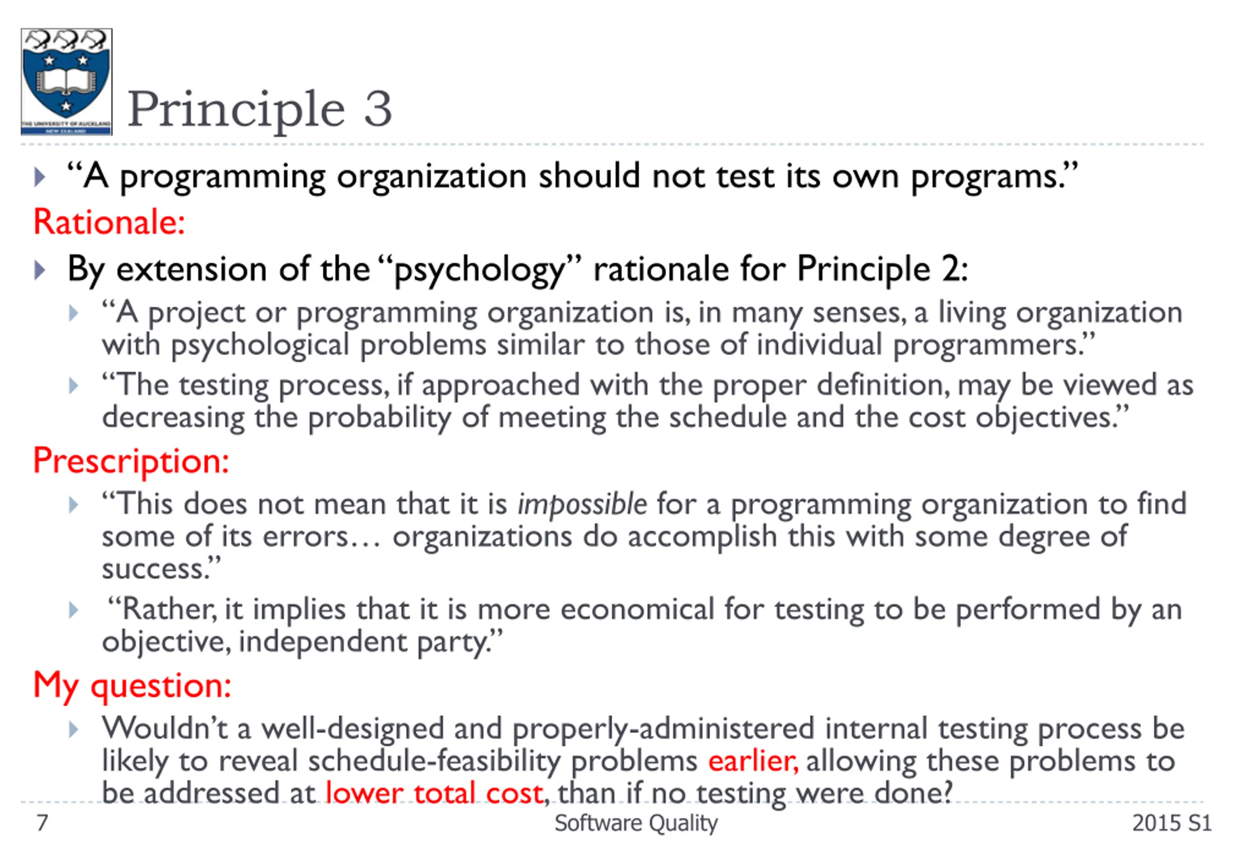 Principle 3 A programming organization should not test its own programs. Rationale: By extension of the psychology rationale for Principle 2: A project or programming organization is, in many senses, a living organization with psychological problems similar to those of individual programmers. The testing process, if approached with the proper definition, may be viewed as decreasing the probability of meeting the schedule and the cost objectives. Prescription: This does not mean that it is impossible for a programming organization to find some of its errors organizations do accomplish this with some degree of success. Rather, it implies that it is more economical for testing to be performed by an objective, independent party. My question: Wouldn t a well-designed and properly-administered internal testing process be likely to reveal schedule-feasibility problems earlier, allowing these problems to be addressed at lower total cost, than if no testing were done? 7 Software Quality 2015 S1