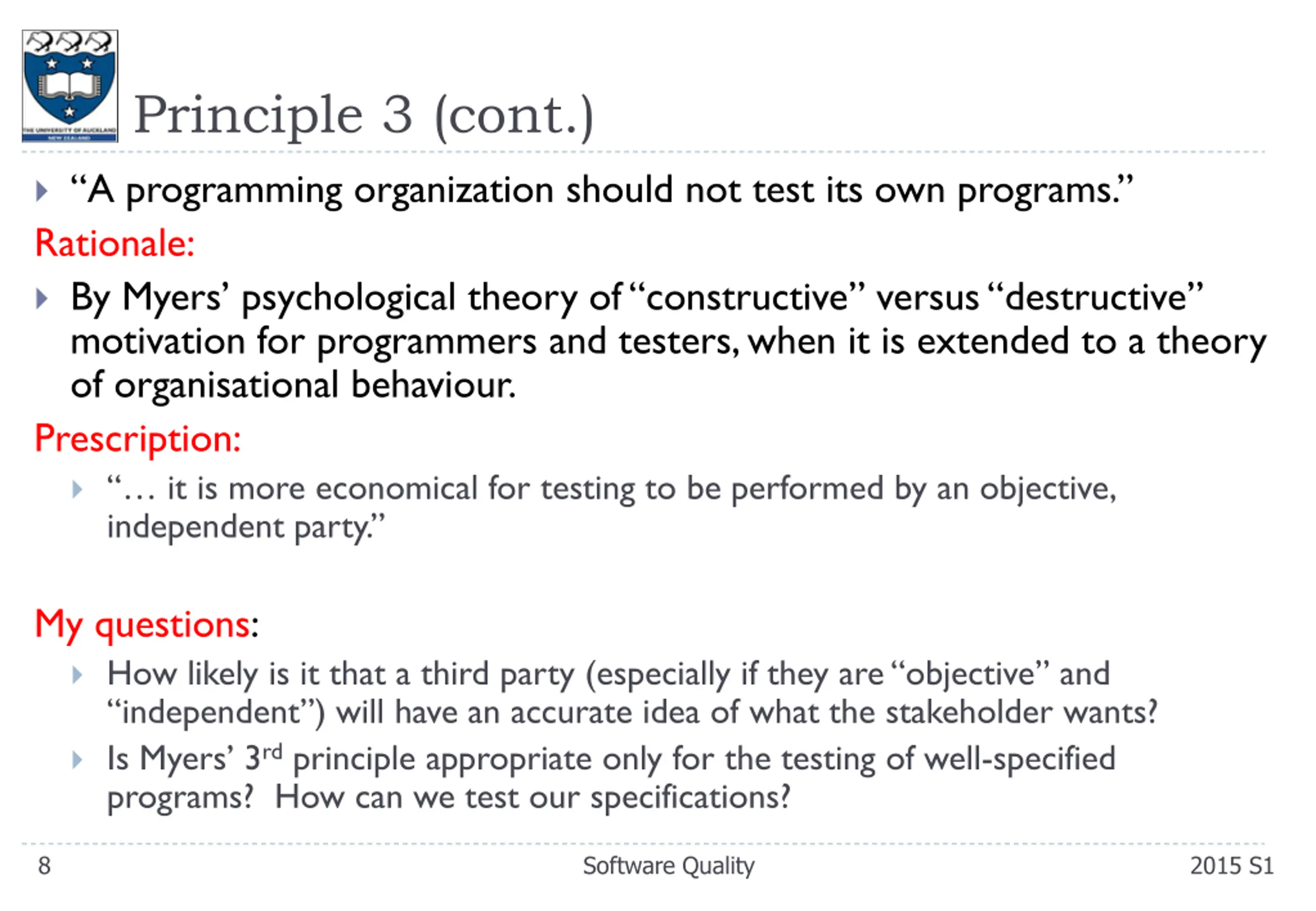 Principle 3 (cont.) A programming organization should not test its own programs. Rationale: By Myers psychological theory of constructive versus destructive motivation for programmers and testers, when it is extended to a theory of organisational behaviour. Prescription: it is more economical for testing to be performed by an objective, independent party. My questions: How likely is it that a third party (especially if they are objective and independent ) will have an accurate idea of what the stakeholder wants? Is Myers 3rd principle appropriate only for the testing of well-specified programs? How can we test our specifications? 8 Software Quality 2015 S1