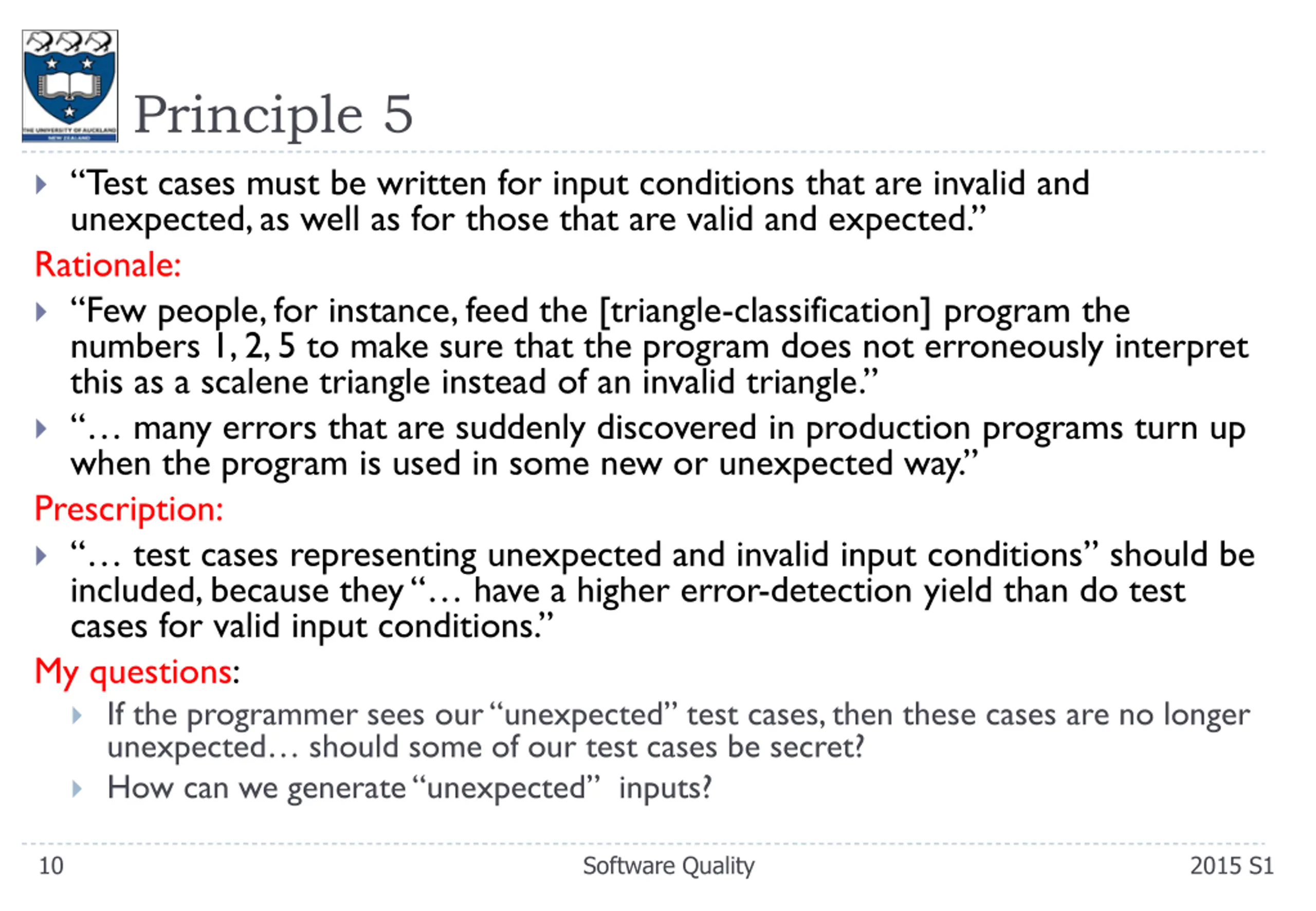 Principle 5 Test cases must be written for input conditions that are invalid and unexpected, as well as for those that are valid and expected. Rationale: Few people, for instance, feed the [triangle-classification] program the numbers 1, 2, 5 to make sure that the program does not erroneously interpret this as a scalene triangle instead of an invalid triangle. many errors that are suddenly discovered in production programs turn up when the program is used in some new or unexpected way. Prescription: test cases representing unexpected and invalid input conditions should be included, because they have a higher error-detection yield than do test cases for valid input conditions. My questions: If the programmer sees our unexpected test cases, then these cases are no longer unexpected should some of our test cases be secret? How can we generate unexpected inputs? 10 Software Quality 2015 S1