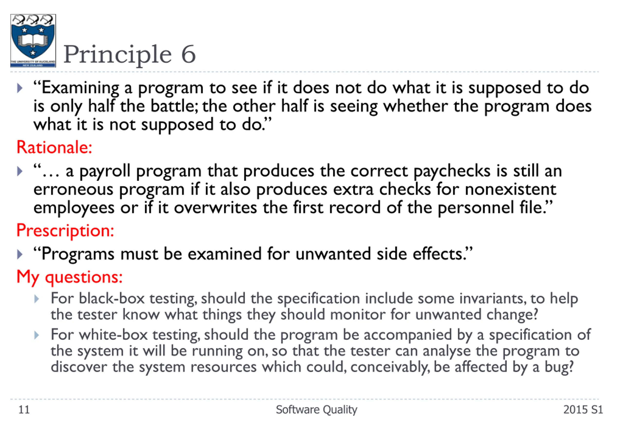 Principle 6 Examining a program to see if it does not do what it is supposed to do is only half the battle; the other half is seeing whether the program does what it is not supposed to do. Rationale: a payroll program that produces the correct paychecks is still an erroneous program if it also produces extra checks for nonexistent employees or if it overwrites the first record of the personnel file. Prescription: Programs must be examined for unwanted side effects. My questions: For black-box testing, should the specification include some invariants, to help the tester know what things they should monitor for unwanted change? For white-box testing, should the program be accompanied by a specification of the system it will be running on, so that the tester can analyse the program to discover the system resources which could, conceivably, be affected by a bug? 11 Software Quality 2015 S1