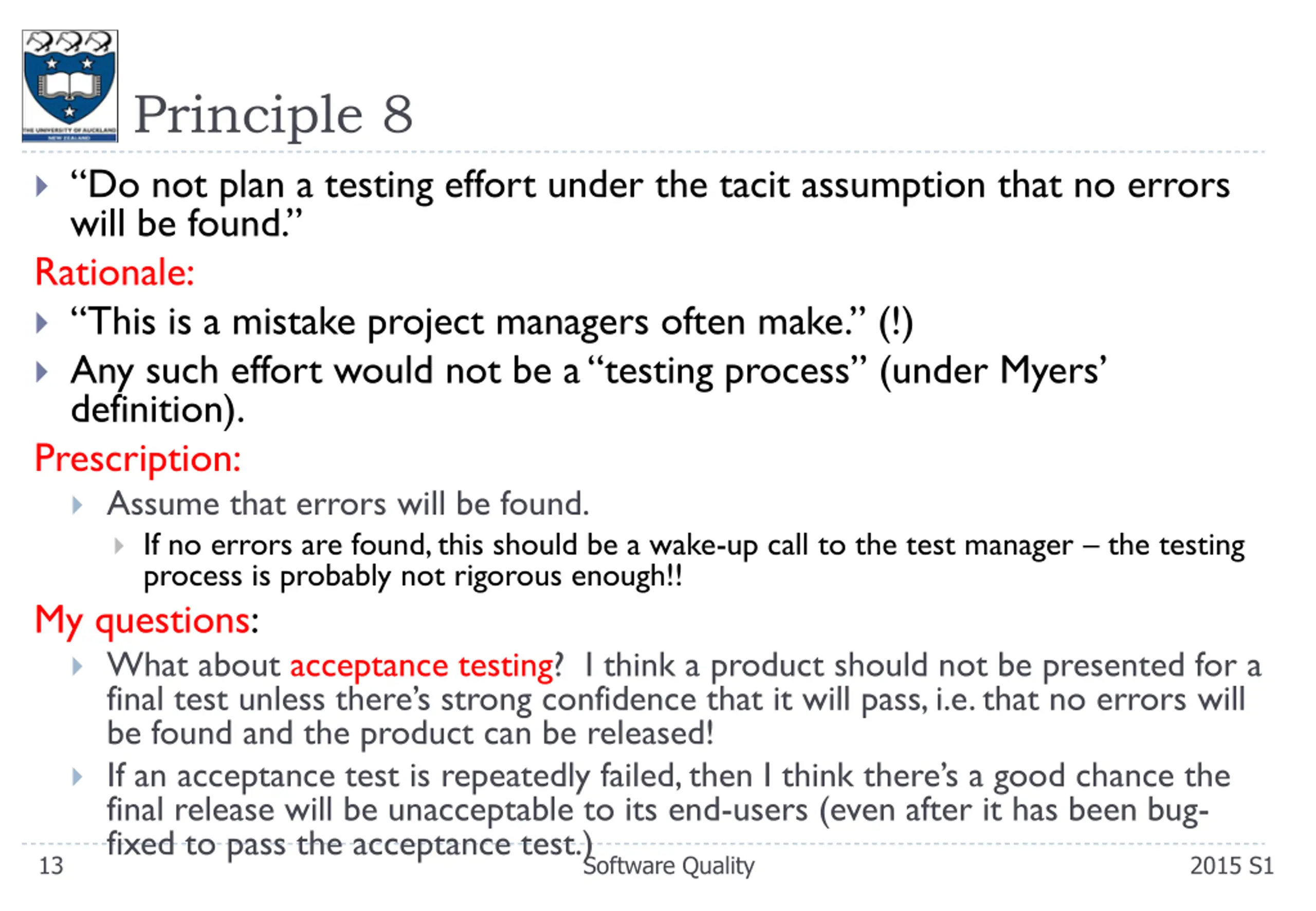 Principle 8 Do not plan a testing effort under the tacit assumption that no errors will be found. Rationale: This is a mistake project managers often make. (!) Any such effort would not be a testing process (under Myers definition). Prescription: Assume that errors will be found. If no errors are found, this should be a wake-up call to the test manager the testing process is probably not rigorous enough!! My questions: What about acceptance testing? I think a product should not be presented for a final test unless there s strong confidence that it will pass, i.e. that no errors will be found and the product can be released! If an acceptance test is repeatedly failed, then I think there s a good chance the final release will be unacceptable to its end-users (even after it has been bug- fixed to pass the acceptance test.) 13 Software Quality 2015 S1