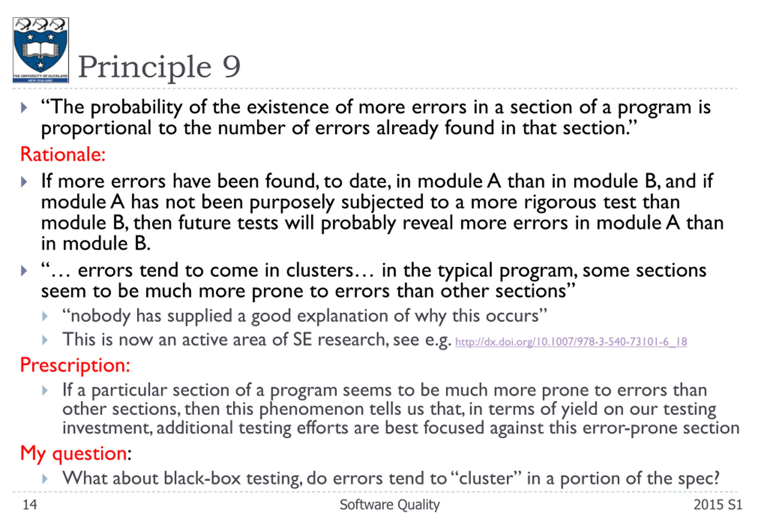 Principle 9 The probability of the existence of more errors in a section of a program is proportional to the number of errors already found in that section. Rationale: If more errors have been found, to date, in module A than in module B, and if module A has not been purposely subjected to a more rigorous test than module B, then future tests will probably reveal more errors in module A than in module B. errors tend to come in clusters in the typical program, some sections seem to be much more prone to errors than other sections nobody has supplied a good explanation of why this occurs This is now an active area of SE research, see e.g. http://dx.doi.org/10.1007/978-3-540-73101-6_18 Prescription: If a particular section of a program seems to be much more prone to errors than other sections, then this phenomenon tells us that, in terms of yield on our testing investment, additional testing efforts are best focused against this error-prone section My question: What about black-box testing, do errors tend to cluster in a portion of the spec? 14 Software Quality 2015 S1