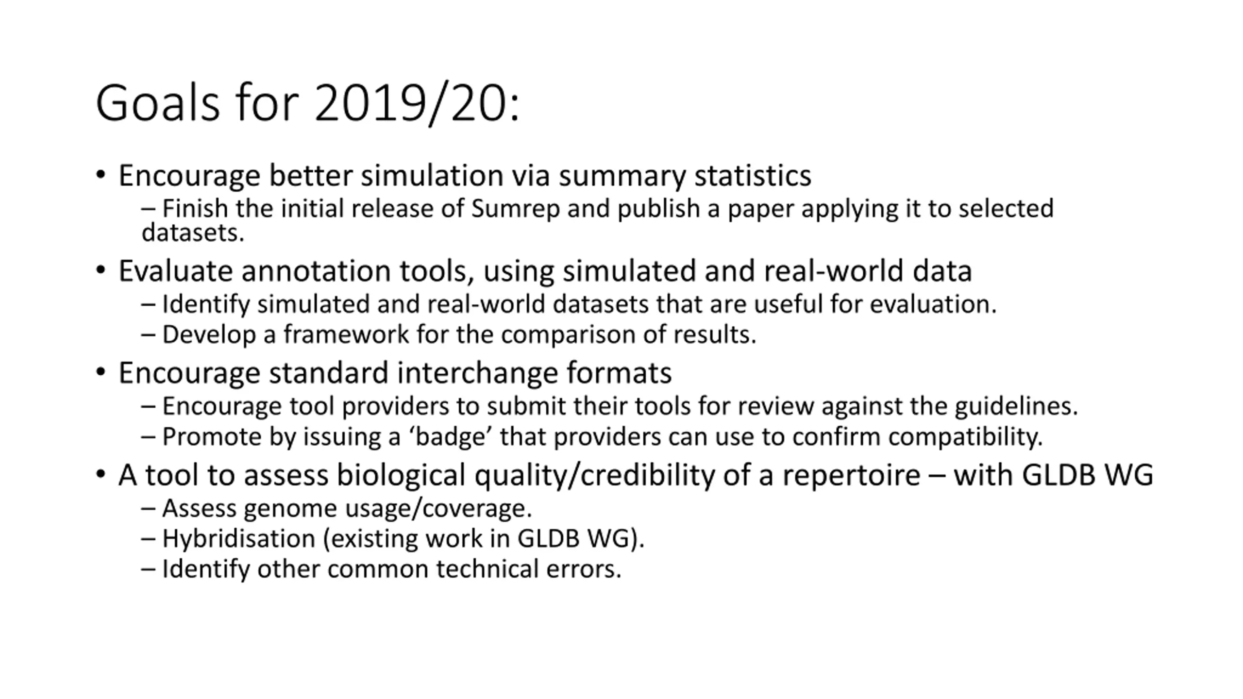 Goals for 2019/20: Encourage better simulation via summary statistics Finish the initial release of Sumrep and publish a paper applying it to selected datasets. Evaluate annotation tools, using simulated and real-world data Identify simulated and real-world datasets that are useful for evaluation. Develop a framework for the comparison of results. Encourage standard interchange formats Encourage tool providers to submit their tools for review against the guidelines. Promote by issuing a badge that providers can use to confirm compatibility. A tool to assess biological quality/credibility of a repertoire with GLDB WG Assess genome usage/coverage. Hybridisation (existing work in GLDB WG). Identify other common technical errors.