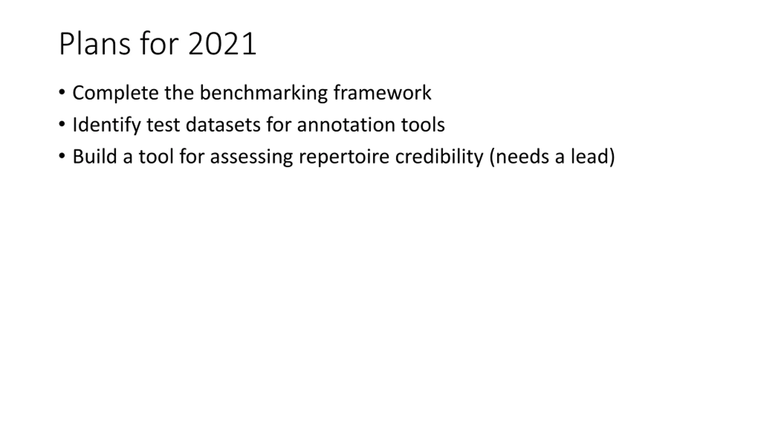 Plans for 2021 Complete the benchmarking framework Identify test datasets for annotation tools Build a tool for assessing repertoire credibility (needs a lead)