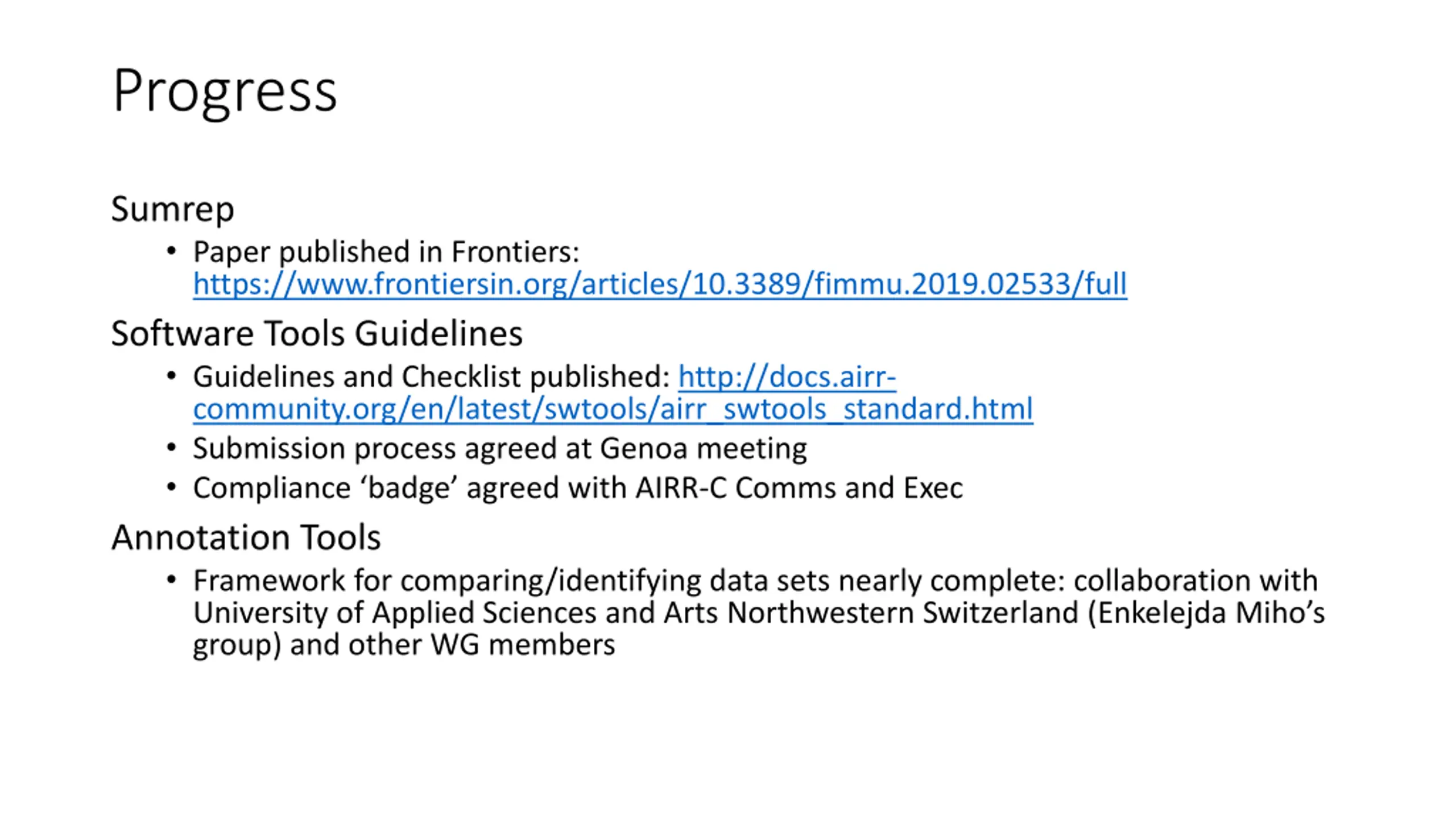 Progress Sumrep Paper published in Frontiers: https://www.frontiersin.org/articles/10.3389/fimmu.2019.02533/full Software Tools Guidelines Guidelines and Checklist published: http://docs.airr- community.org/en/latest/swtools/airr_swtools_standard.html Submission process agreed at Genoa meeting Compliance badge agreed with AIRR-C Comms and Exec Annotation Tools Framework for comparing/identifying data sets nearly complete: collaboration with University of Applied Sciences and Arts Northwestern Switzerland (Enkelejda Miho s group) and other WG members
