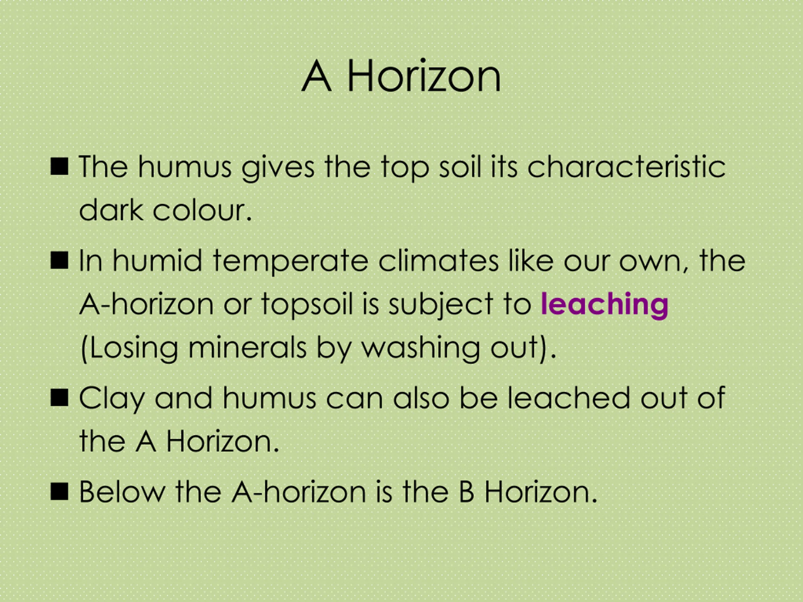 A Horizon The humus gives the top soil its characteristic dark colour. In humid temperate climates like our own, the A-horizon or topsoil is subject to leaching (Losing minerals by washing out). Clay and humus can also be leached out of the A Horizon. Below the A-horizon is the B Horizon.